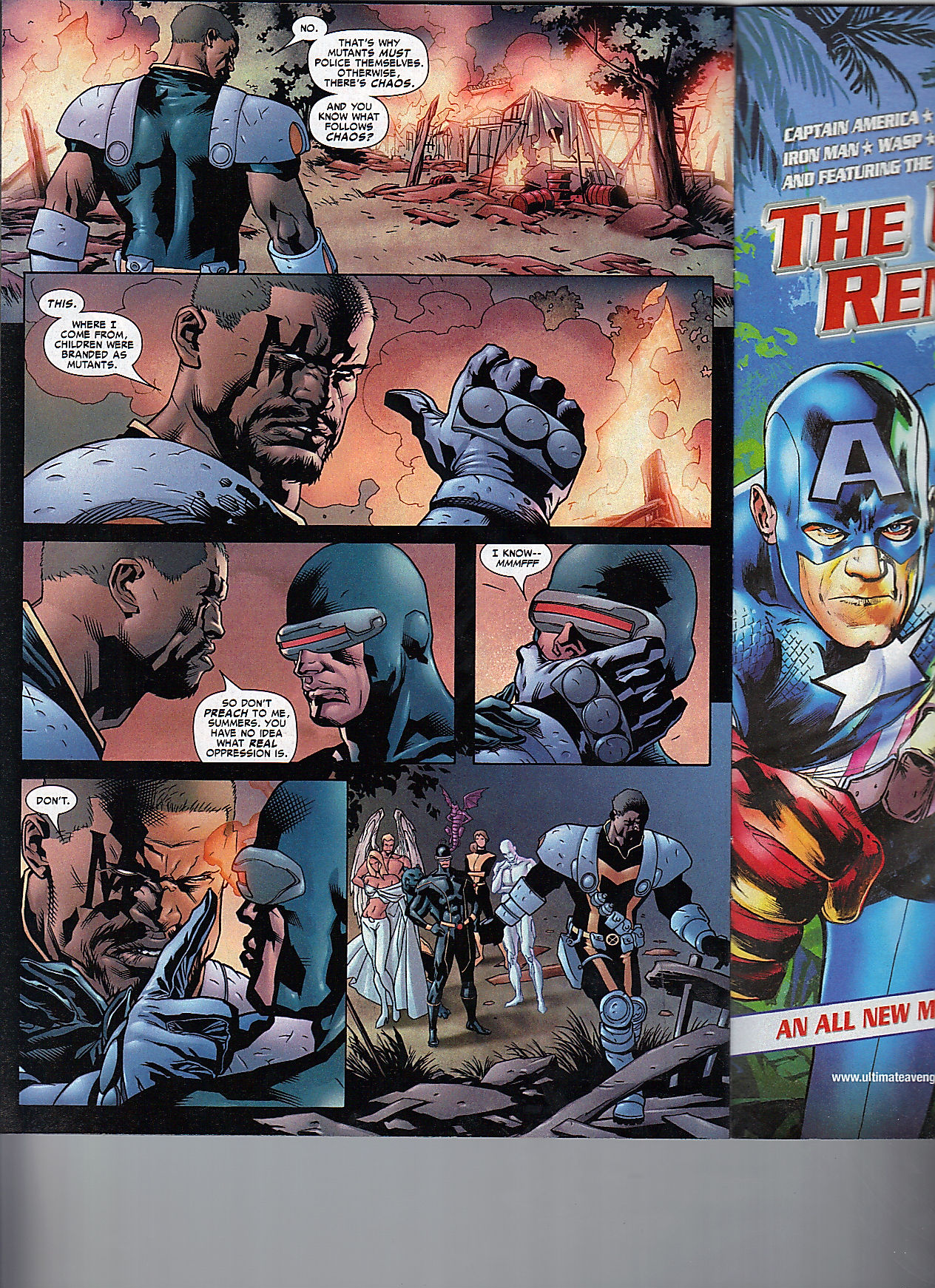 Colossus begins to make a move but Siryn shuts him down. Cyclops blasts Madrox, which instantly creates ten of him. Madrox stands up to Cyclops, daring him to blast him a few more times.
