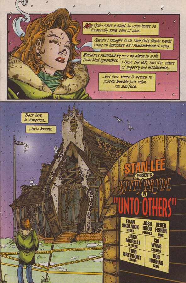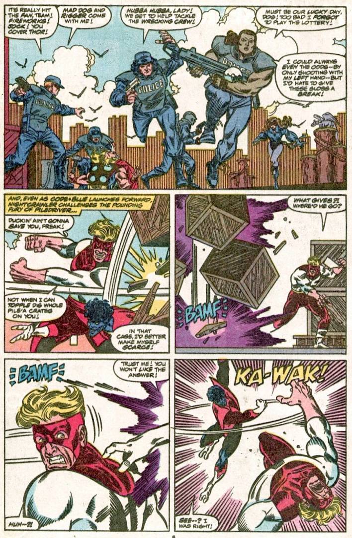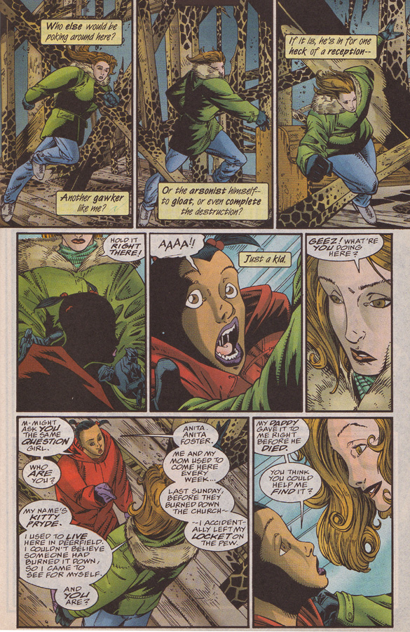 Since the last time Shadowcat saw Nightcrawler, he was jumping into a jet and flying to America – so she has been waiting for any sign that he is okay. Look at that sweet looking Lockheed, by Lashley & Elliott. His shade of purple is pretty nice as well, good job Matthys & Garrahy! Makes him look a little grim.