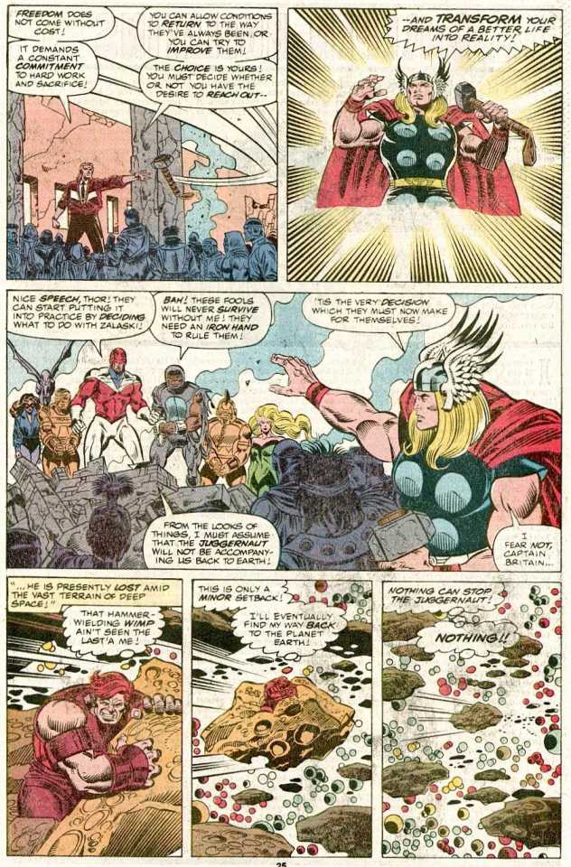 People are fighting in the streets. This is all due to D’Spayre and his lady companion, Margali (Amanda Sefton’s mother, who is green at the moment). I feel like this is the fourth comic I own with D’Spayre, and as silly as his name is, I sort of dig him. He’s causing all types of despair (get it?) to the good Germans. We haven’t seen D’Spayre in these pages since Excalibur 35.