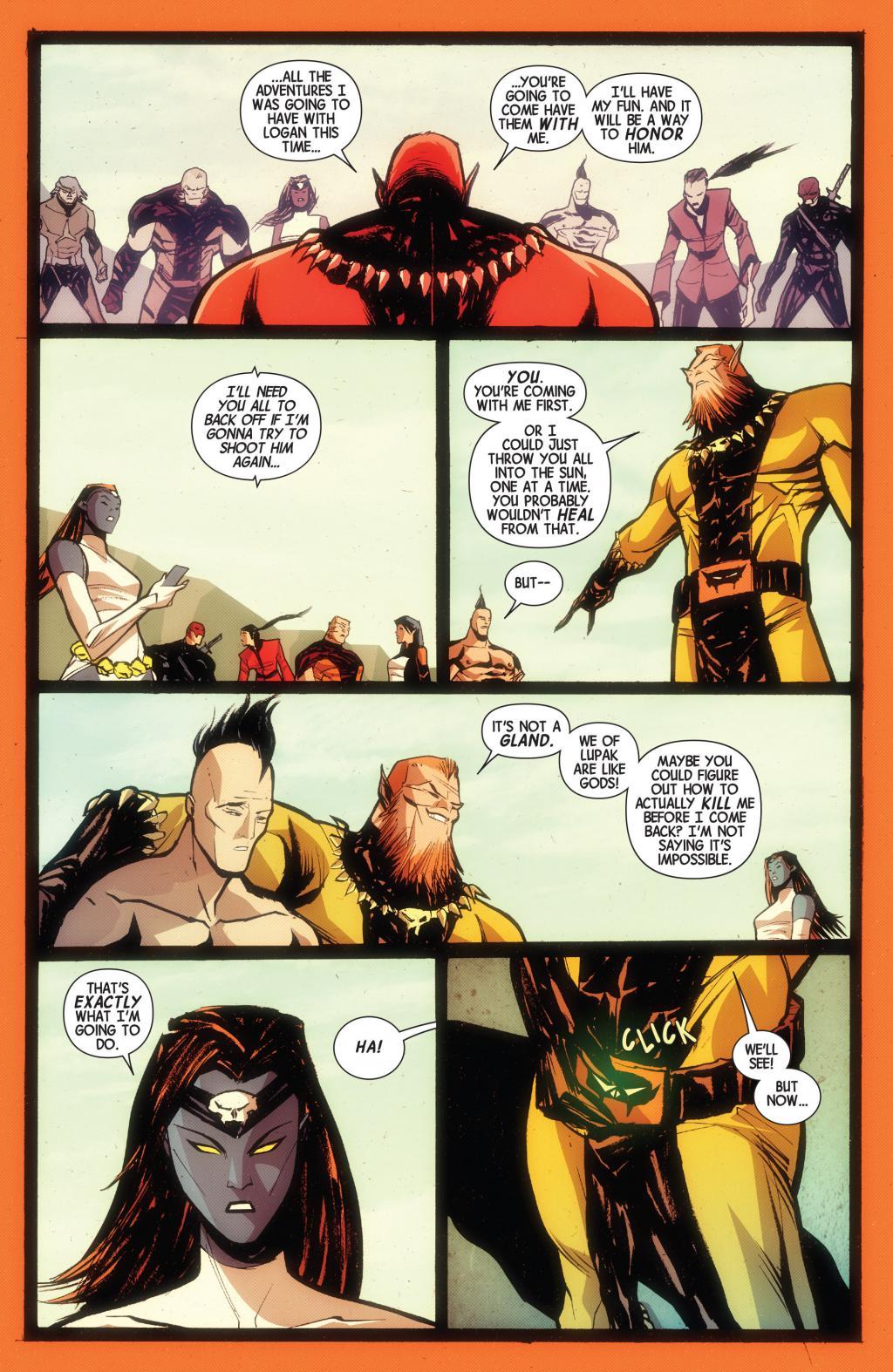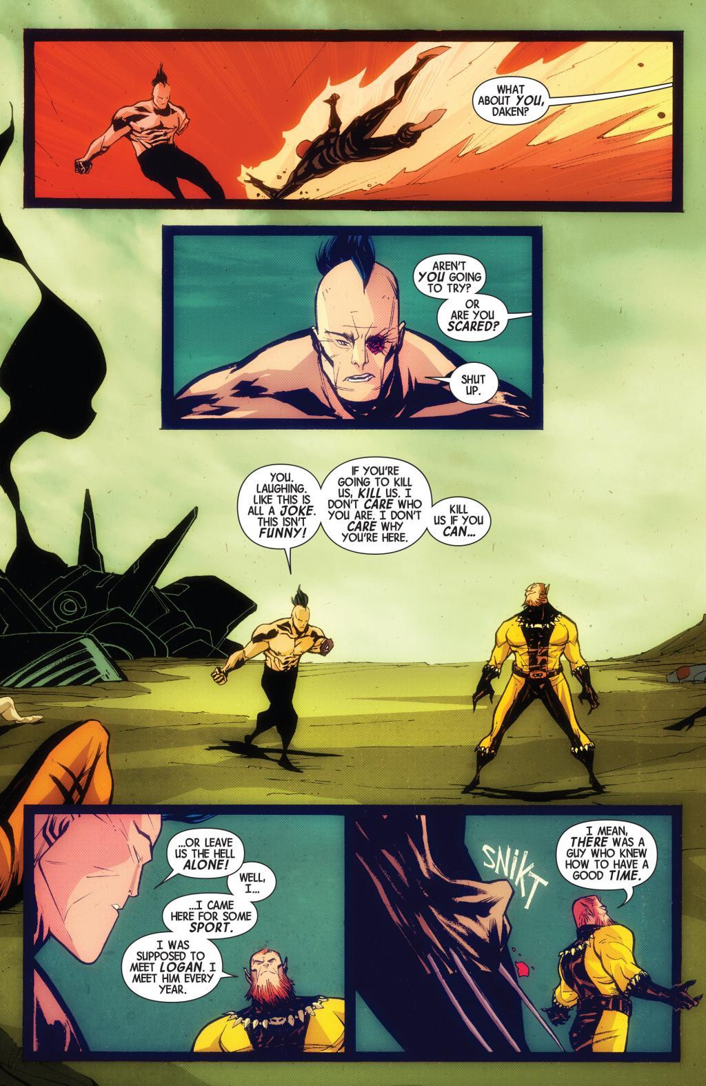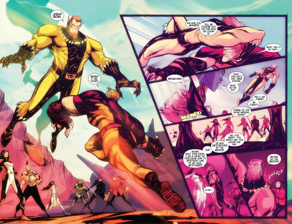 Back with the Wolverines, X23 is without her healing factor for the first time. She wonders when the pain stops, and Daken tells her that it doesn’t. Sabretooth wants to go after Siphon, and he teleports right in front of them. They know that Siphon has been drained again and by that, they know that Mystique must be near by. Daken wants to use Siphon as a bloodhound to track Mystique.