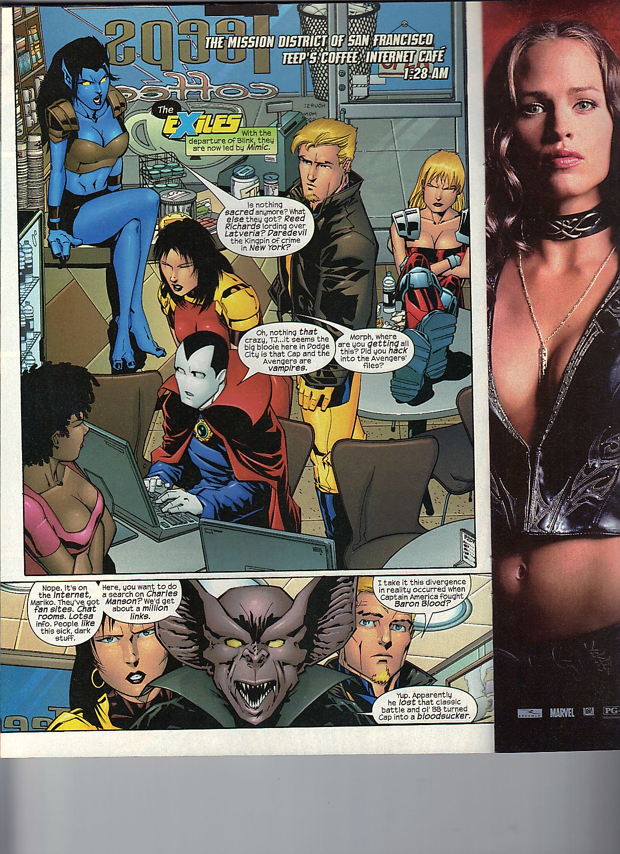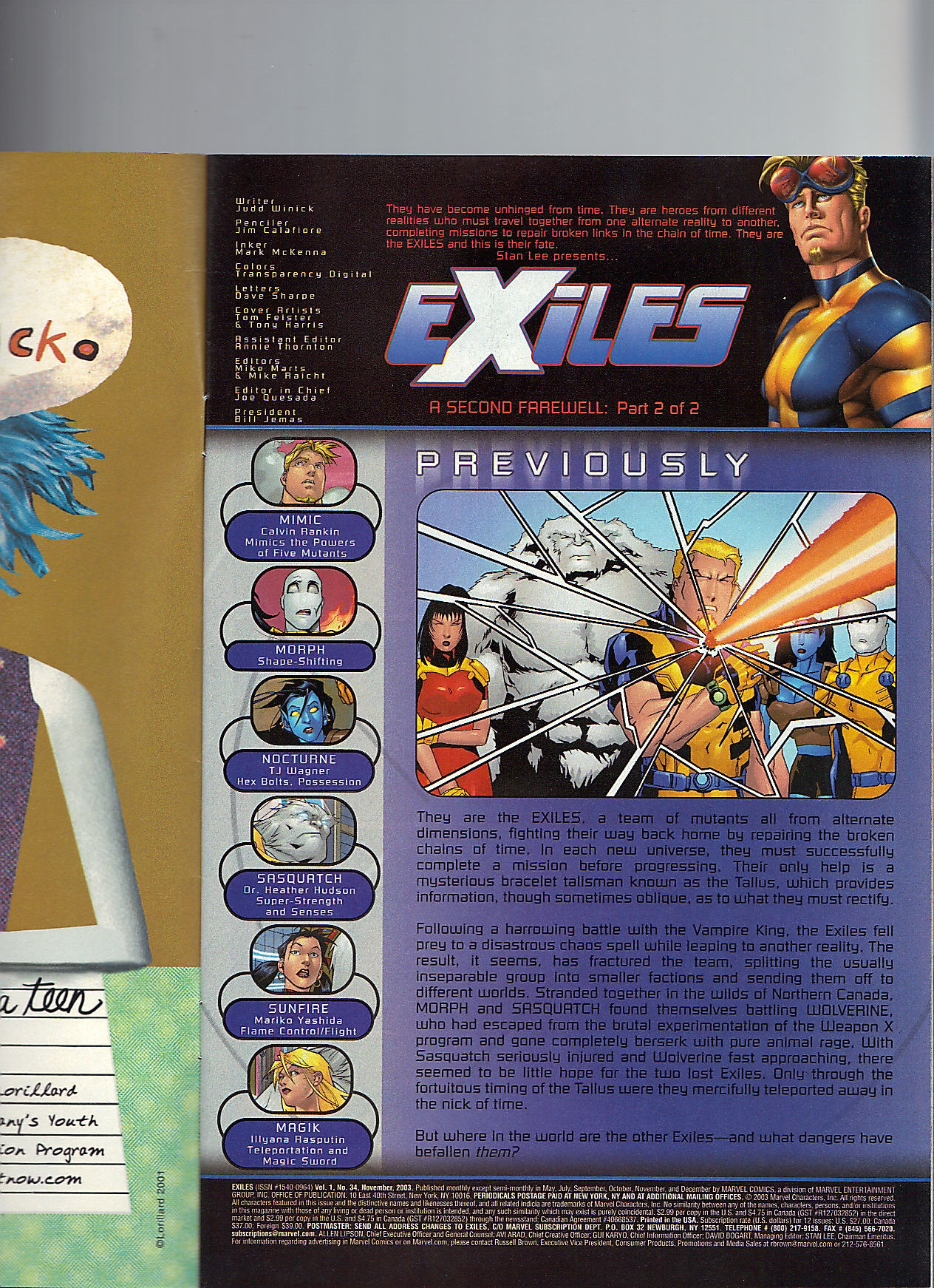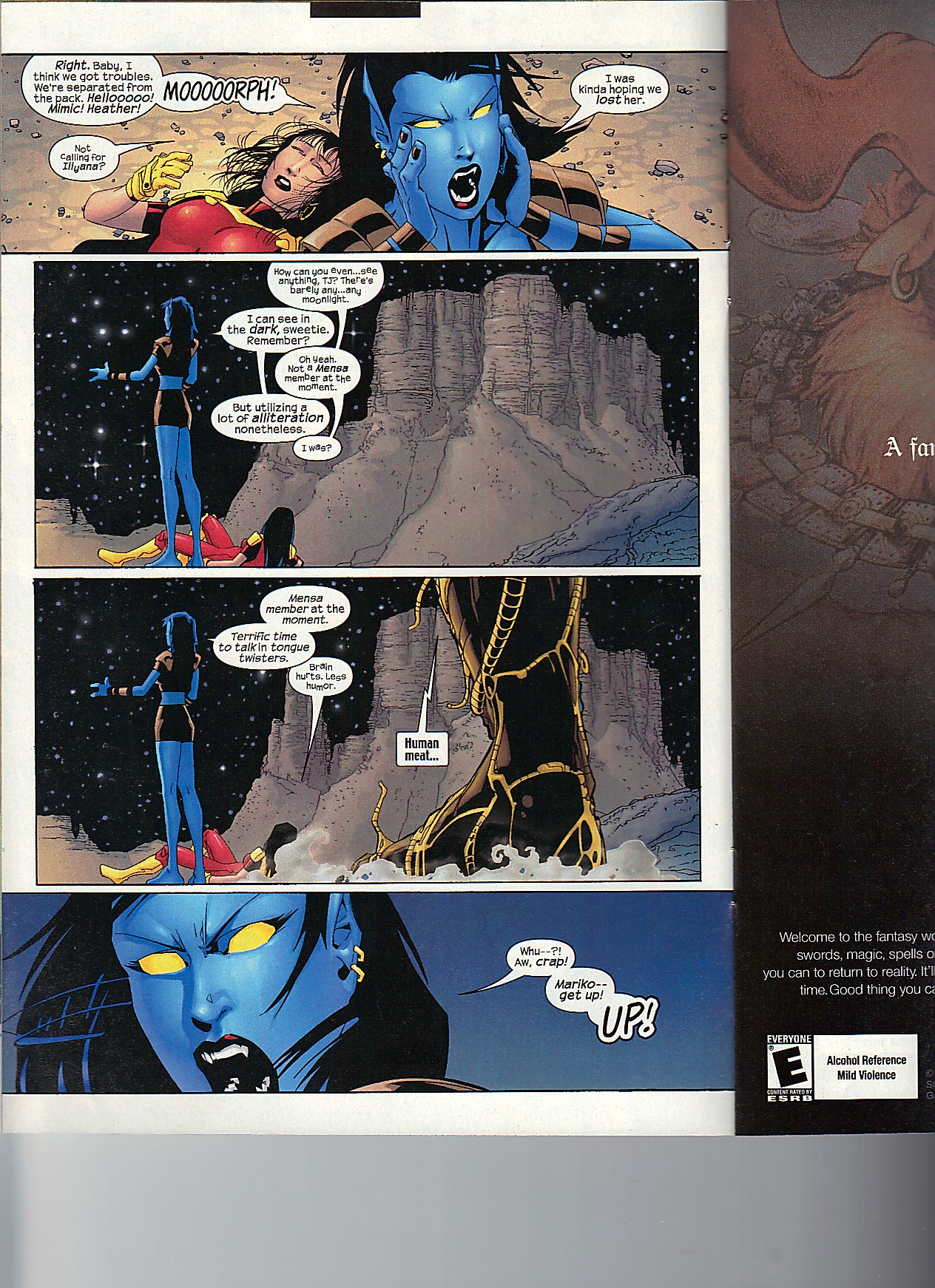 I literally only own this issue because Magik is listed as one of the dead members of Exiles. They are listing the dead due to Mimic being the latest dead member. Which causes Blink to be pretty sad as he was her boyfriend.