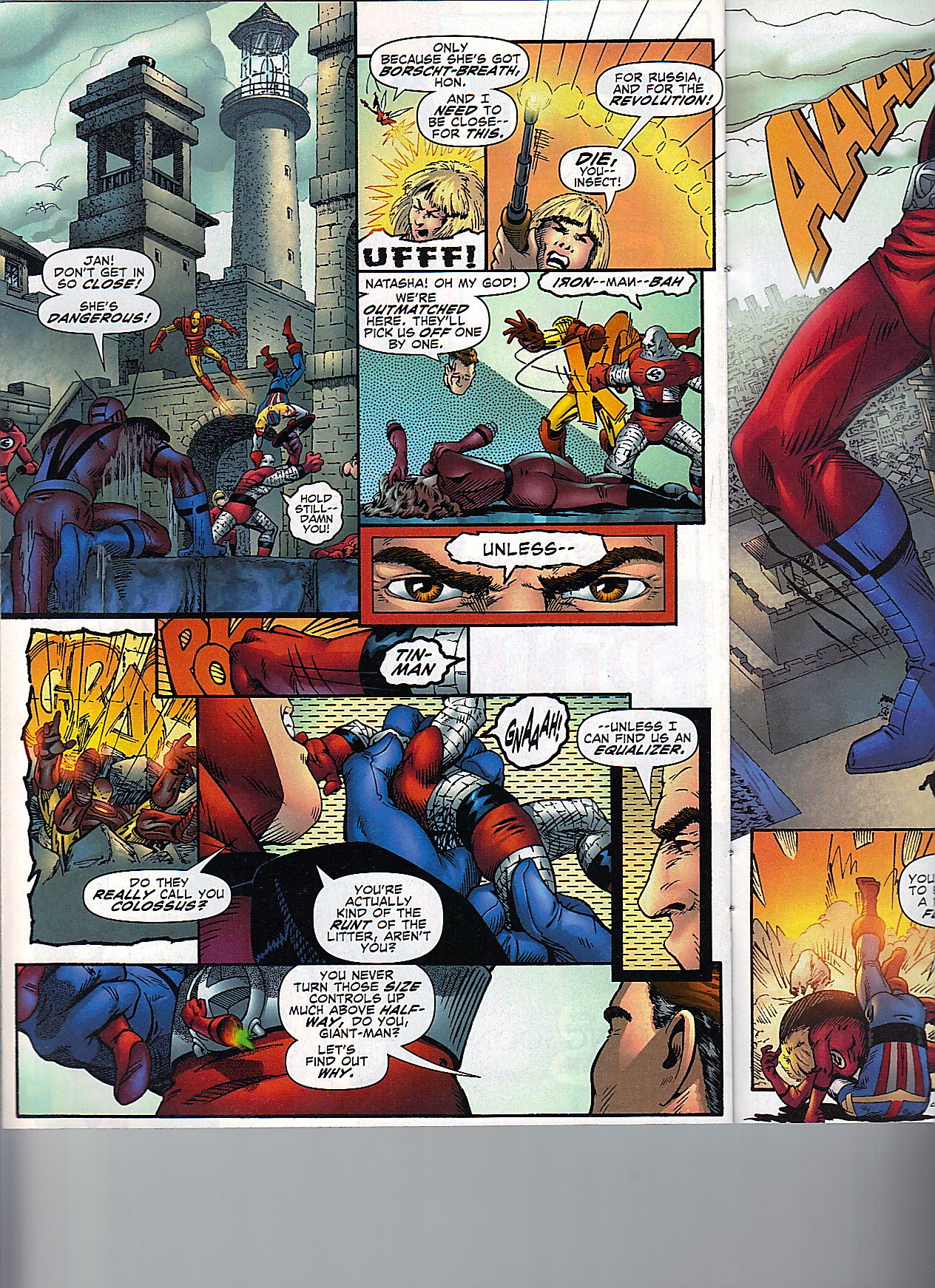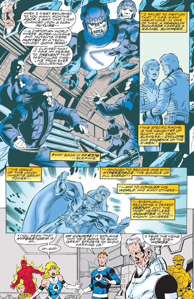 Cyclops makes a tasteless joke about Nightcrawler writing a book titled, Mein Bamf. Which really? A parody name of Mein Kamf, that isn’t a joke that should be made. He makes up for it (only slightly) for calling the Fantastic Four, senior citizens. Storm crates a thunderstorm above the Thing. Cycops turns his attention to the Human Torch and optic blasts his chair BUT he mentions how Torch has a hot seat in more ways than one, then optic blasts it. But Cyclops’ optic blasts are not flame related, so that joke shouldn’t work. I suspect it doesn’t.