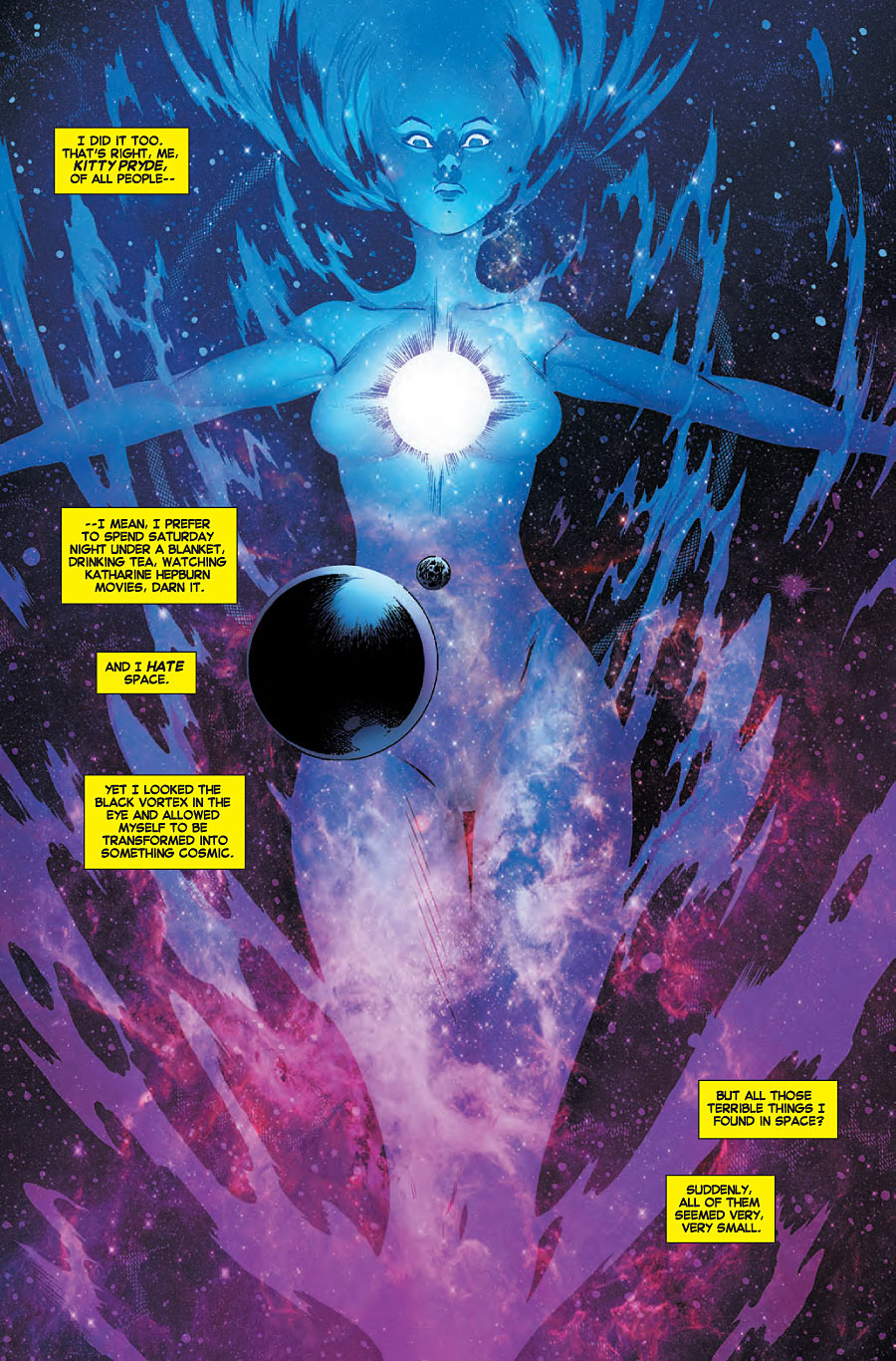 Shadowcat narrates the entire issue, for us. Kitty has been given a cosmic upgrade but has also disappeared in front of everybody.