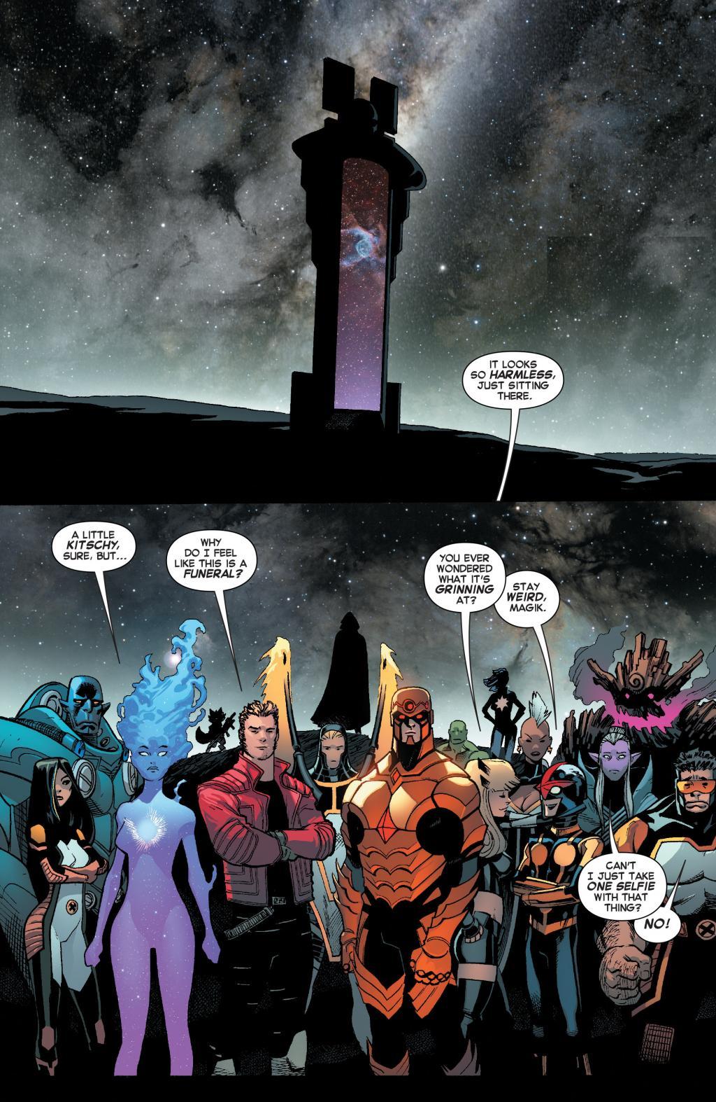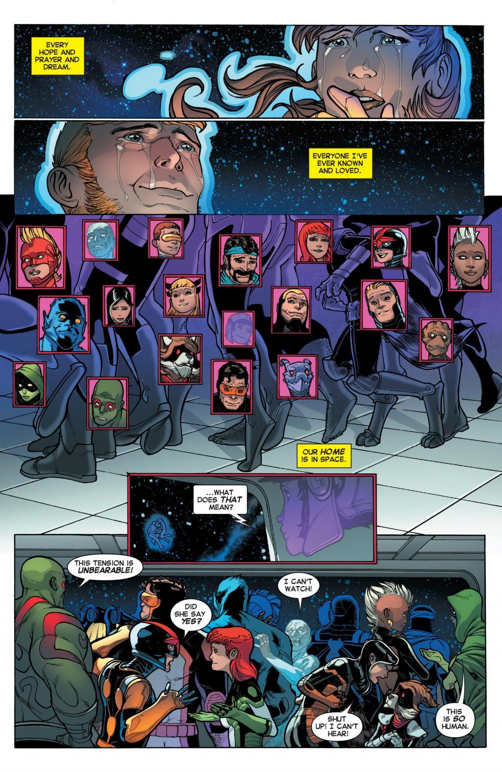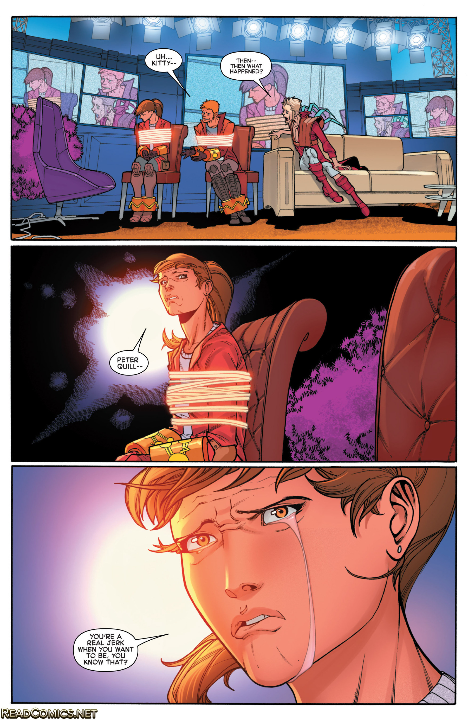 Pryde and Quill are crying. Look at that weird middle panel with all of the headshots, those look so odd.