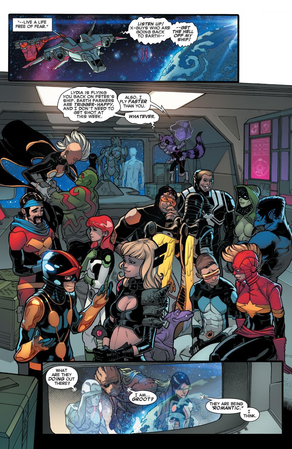 Nova and Magik are still chatting about. Is Drax and Storm dancing? Rocket explains that the X-Men are taking the Hot Rod back to Earth, as he doesn’t want to get anywhere near that planet. Corsair is talking to the younger version of his former daughter-in-law. What could Lockheed, Scott and Carol be talking about? Lockheed seems to be very interested in the conversation.