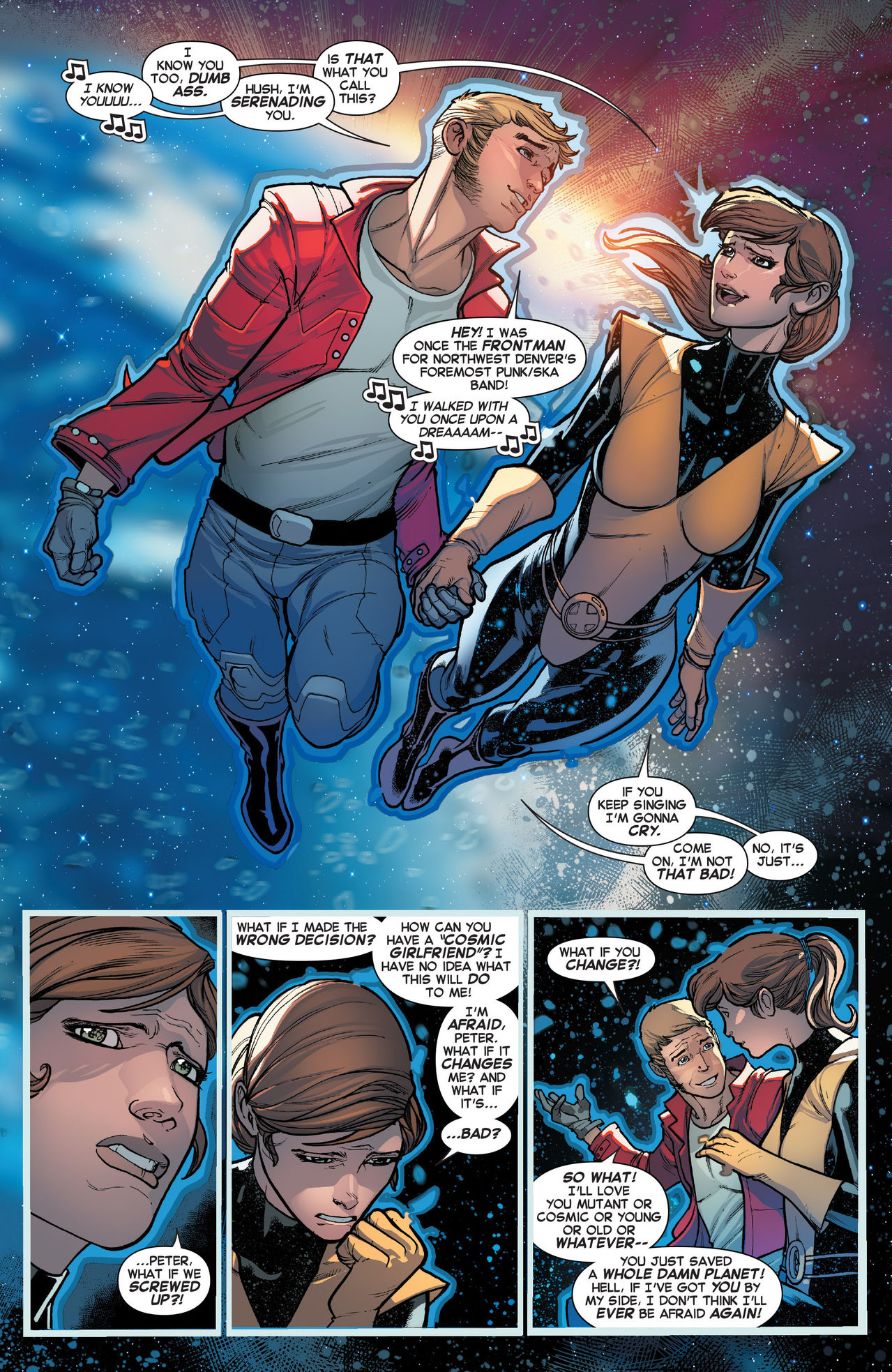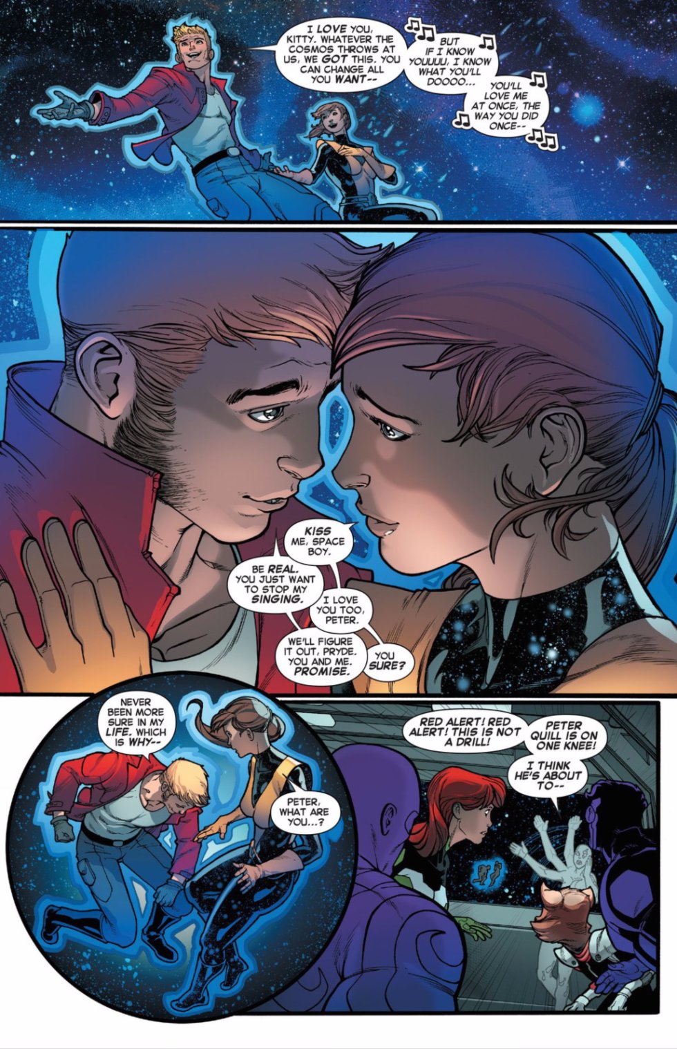 We get the highlight reel of StarKat. Quill proposing to Pryde during Black Vortex. Holographic Pryde breaking Quill out of prison during Legendary Star Lord 3 and one of their later dates (issue 6). They finished with Quill apologizing to Pryde, in snow -from Legendary Star Lord 4.