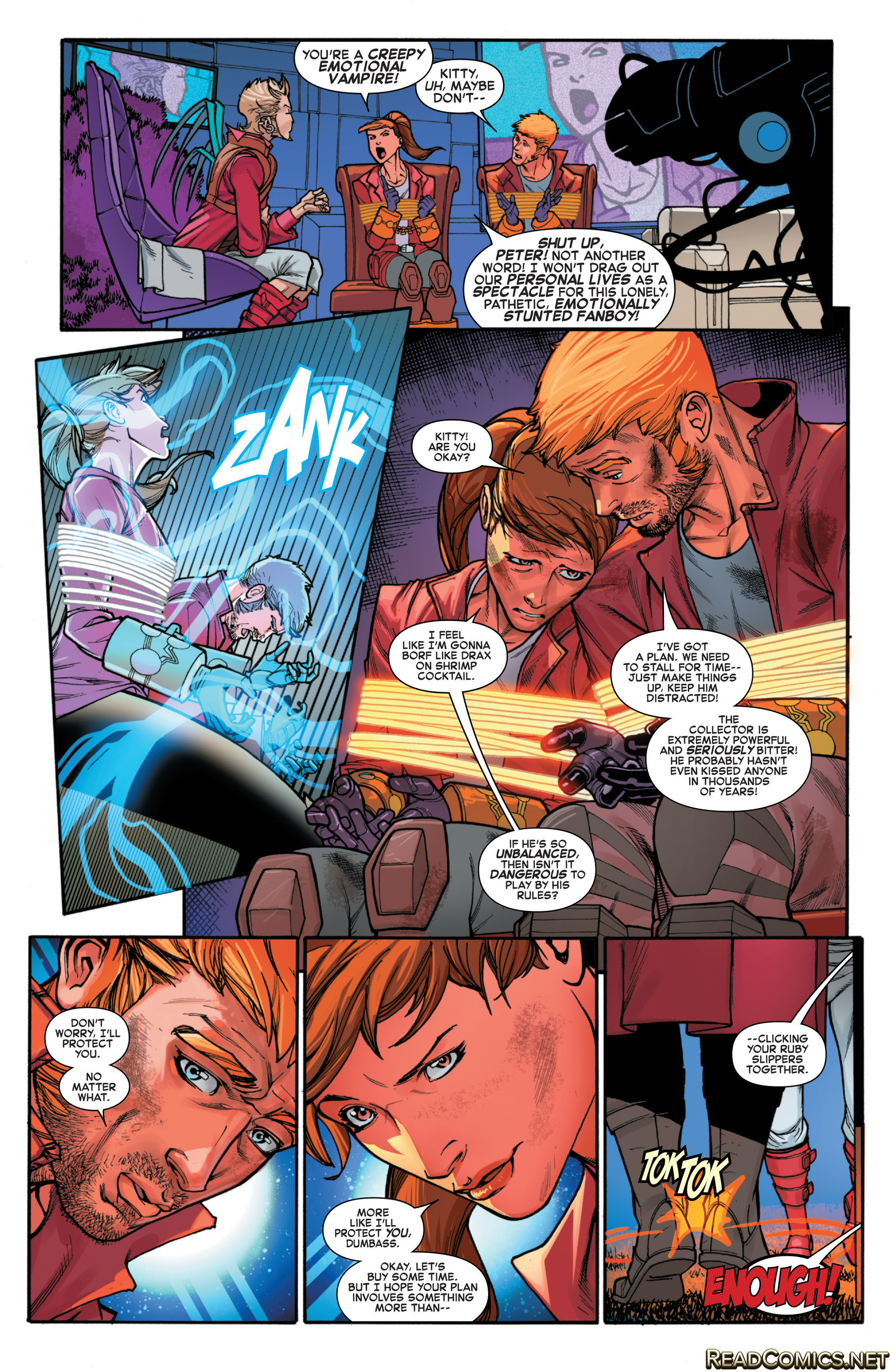 Quill is talking to Gamora, who has no sympathy for him. Pryde is talking to Rocket, who really need a buddy book! Garron does a great job of staging with these mirrored pages.