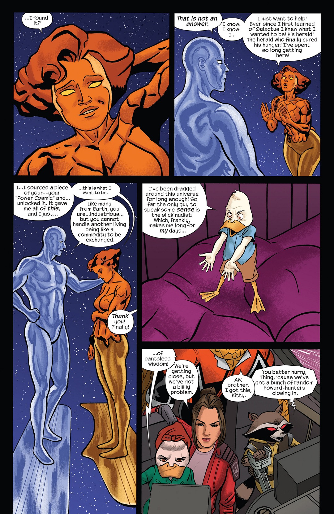 Once Scout has explained that Howard is the Living Nexus of Realities so she can open portals to a vast number of planets that Galactus can dine on. This intrigues Galactus. Howard stands up for himself and Galactus is tempted to to make Howard his new herald. This upsets Scout.