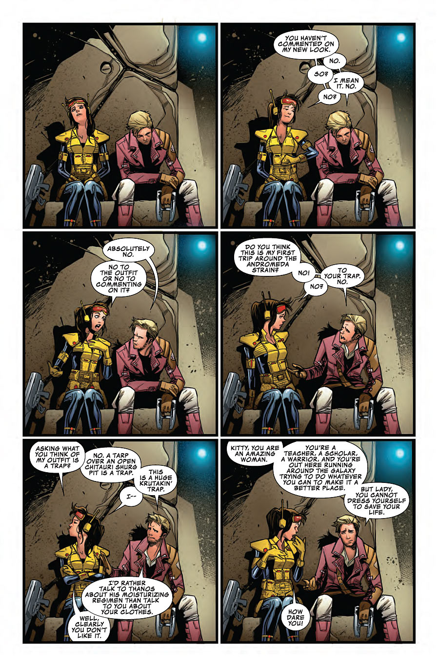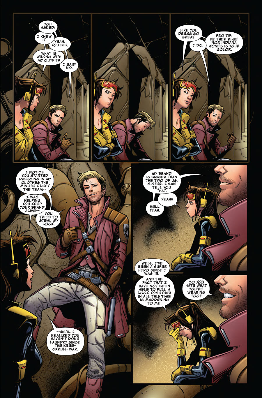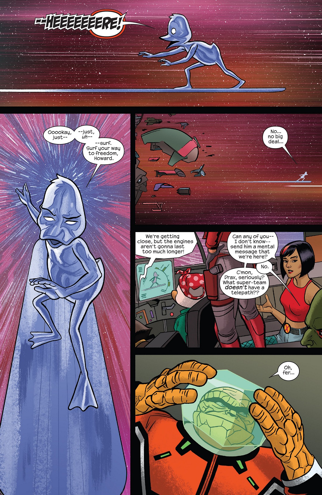 This must be the first time Pryde and Howard have met, as they don’t know each other. He thinks, very funnily, that this is Quill, but now a woman. Pryde quickly recaps how Quill is out and she’s replacing him and the team hasn’t been happier.