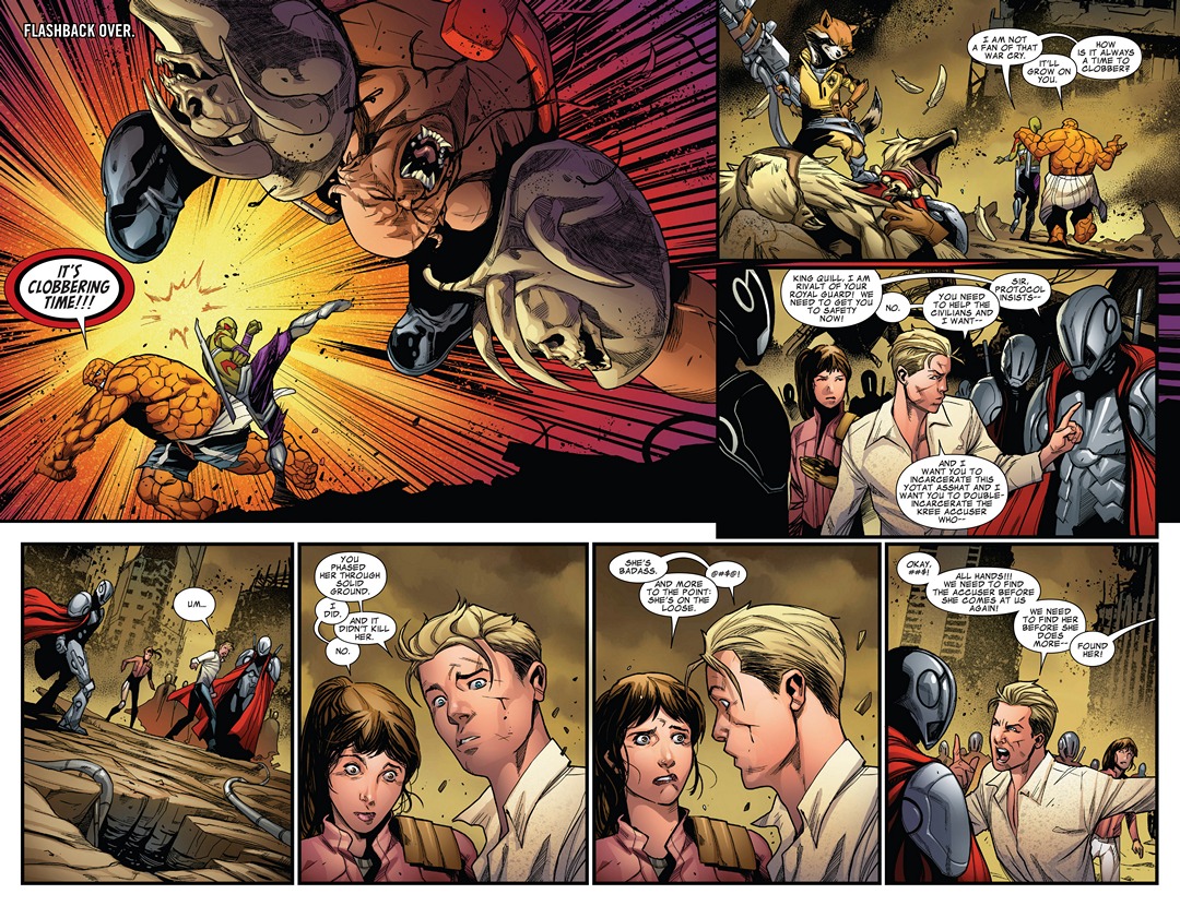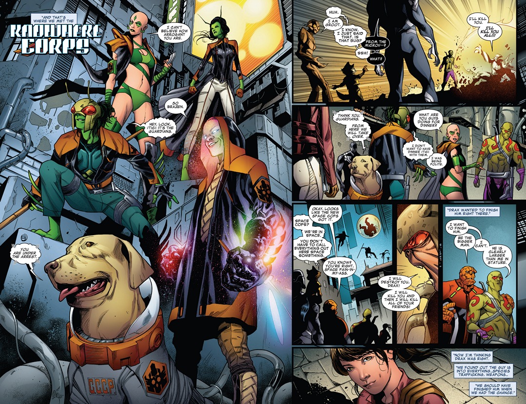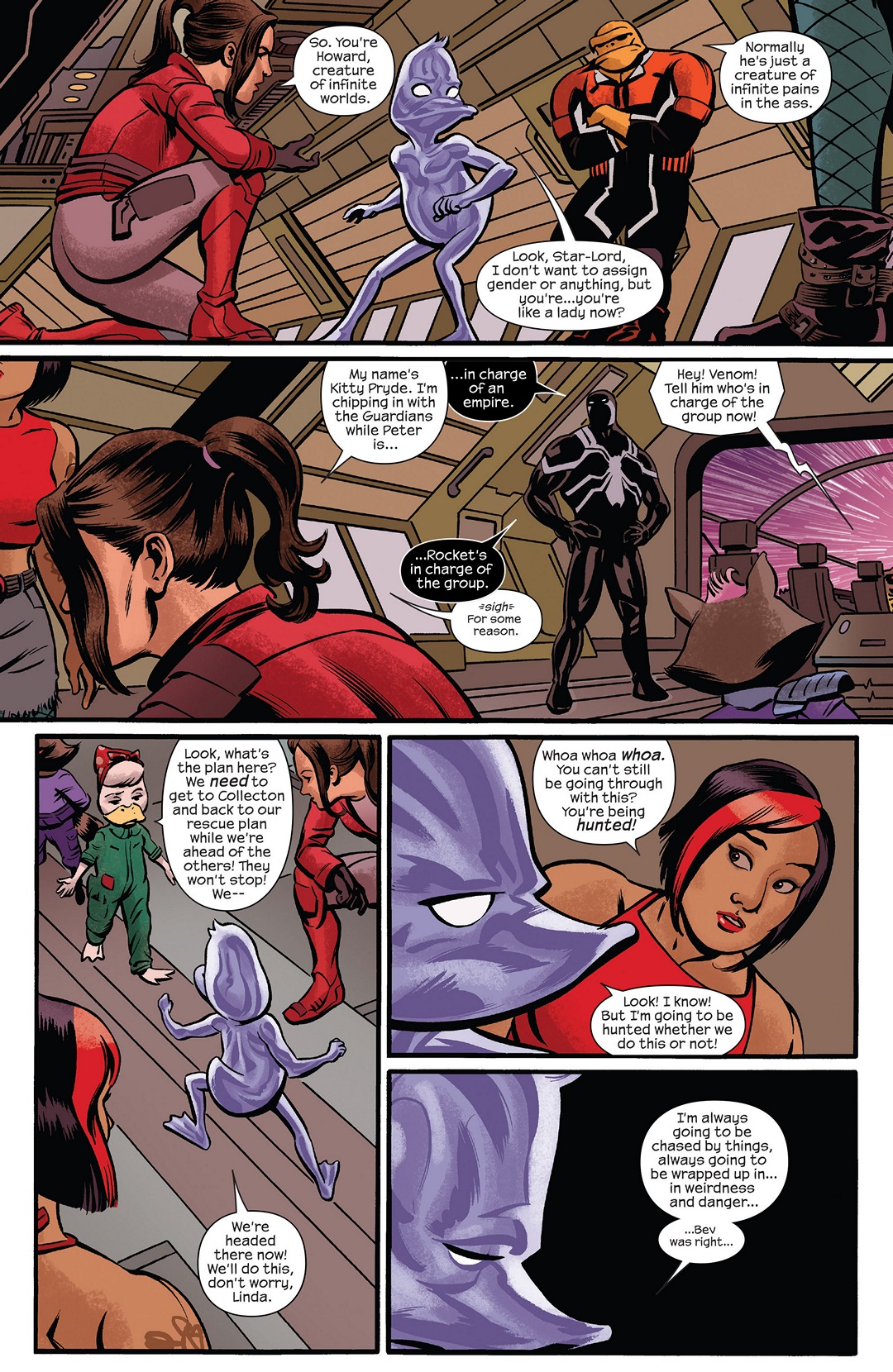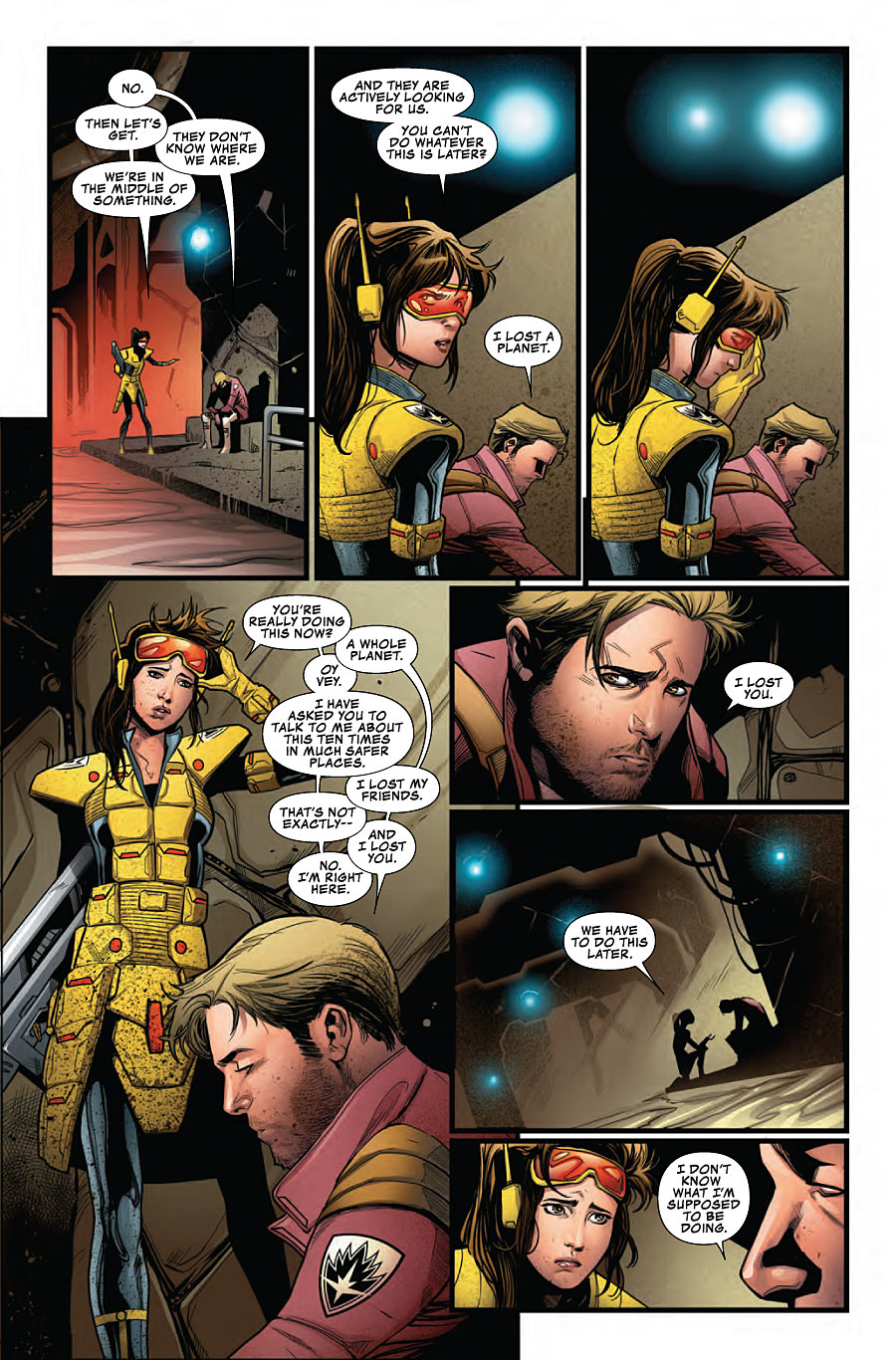 This must be the first time Pryde and Howard have met, as they don’t know each other. He thinks, very funnily, that this is Quill, but now a woman. Pryde quickly recaps how Quill is out and she’s replacing him and the team hasn’t been happier.