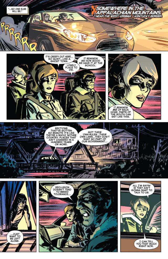 Kitty, Xavier, Krystal and the biker gang finally get to Rogue and Wolverine. This is the first time Kitty has been with these two in over two issues.
