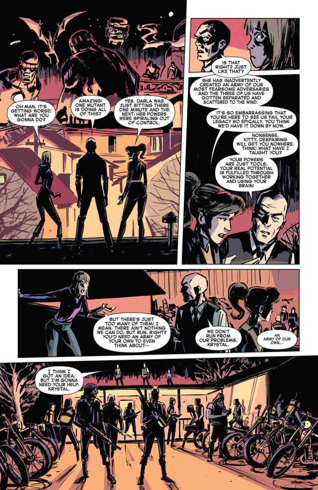 Krystal agrees to turn the biker gang into Kitty and Xavier’s new army. With this page, Revel starts to really play with page layouts and I really like it. In this two page spread we get fourteen panels of varying shapes and sizes and it is awesome.