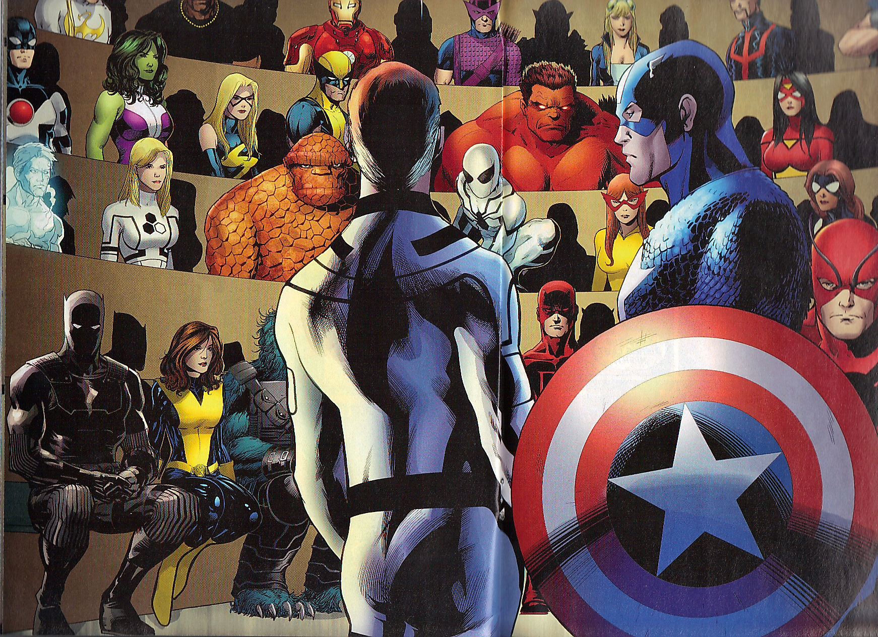 We see all of the Avengers and all the X-Men gathered in groups. Iron Man is telling Captain America, that they can’t just lock up the X-Men. For two reasons, they have no real crime to lock them up for and there isn’t a location that can house all of the X-Men. I like how Iron Man gives Cyclops the benefit of doubt and that this may have been why he surrendered so easily, to prove that the Avengers don’t know what they are doing.