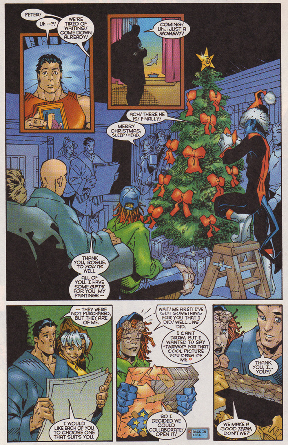 Issue ends with the X-Men around the tree, Colossus presents to everyone are his paintings.