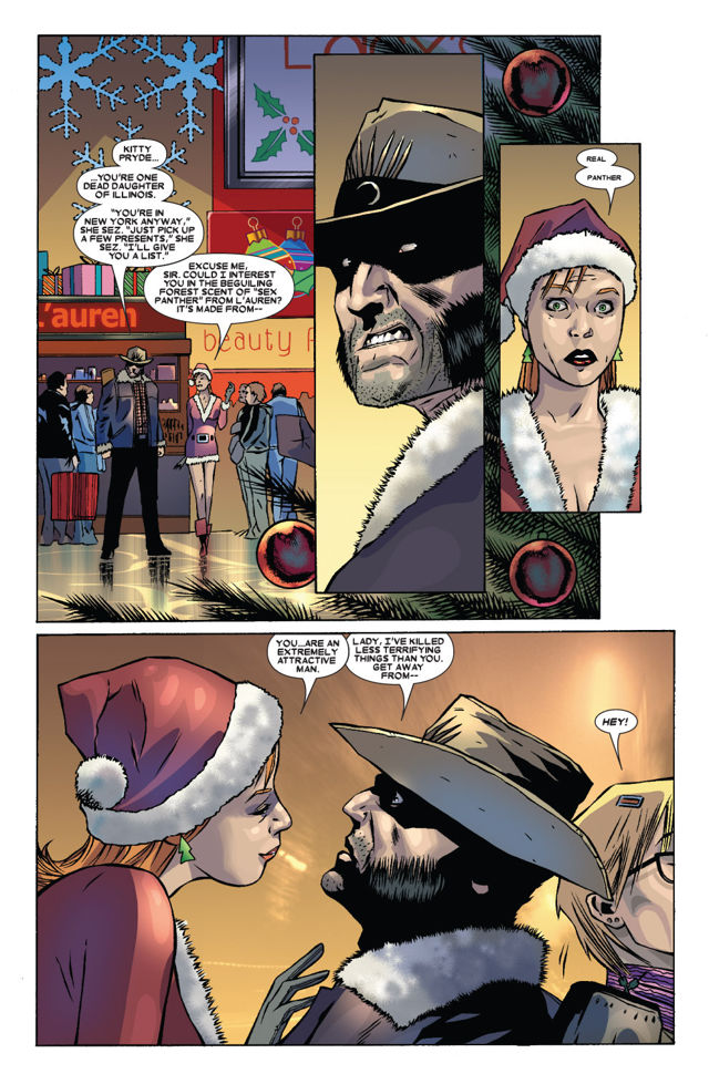 Wolverine is in New York City due to Kitty Pryde sending him to Lacy’s (the Macy’s of Marvel, I suppose) so that he can do some holiday shopping for her.