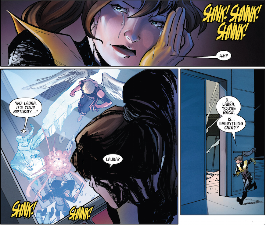 X23, Sabretooth (who is colored blue throughout this issue, but not everytime) and Lady Deathstrike arrive on the scene. X23 wants to know where the others were teleported too. Portal just teleports them to that location as well.