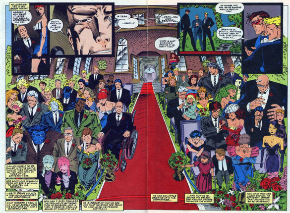 We get a nice moment where Xavier moves from his awesome 90s Shi’ar chair to a more traditional wheelchair. He can’t have people knowing that he is a mutant. Which is odd that he kept that secret for as long as he did. Also odd that with Archangel and Beast present, as well as Nightcrawler, that is three blue mutants walking around. How many guests could either Jean and Scott possibly invited that don’t know that they are mutants or the secret of the Xavier Mansion?