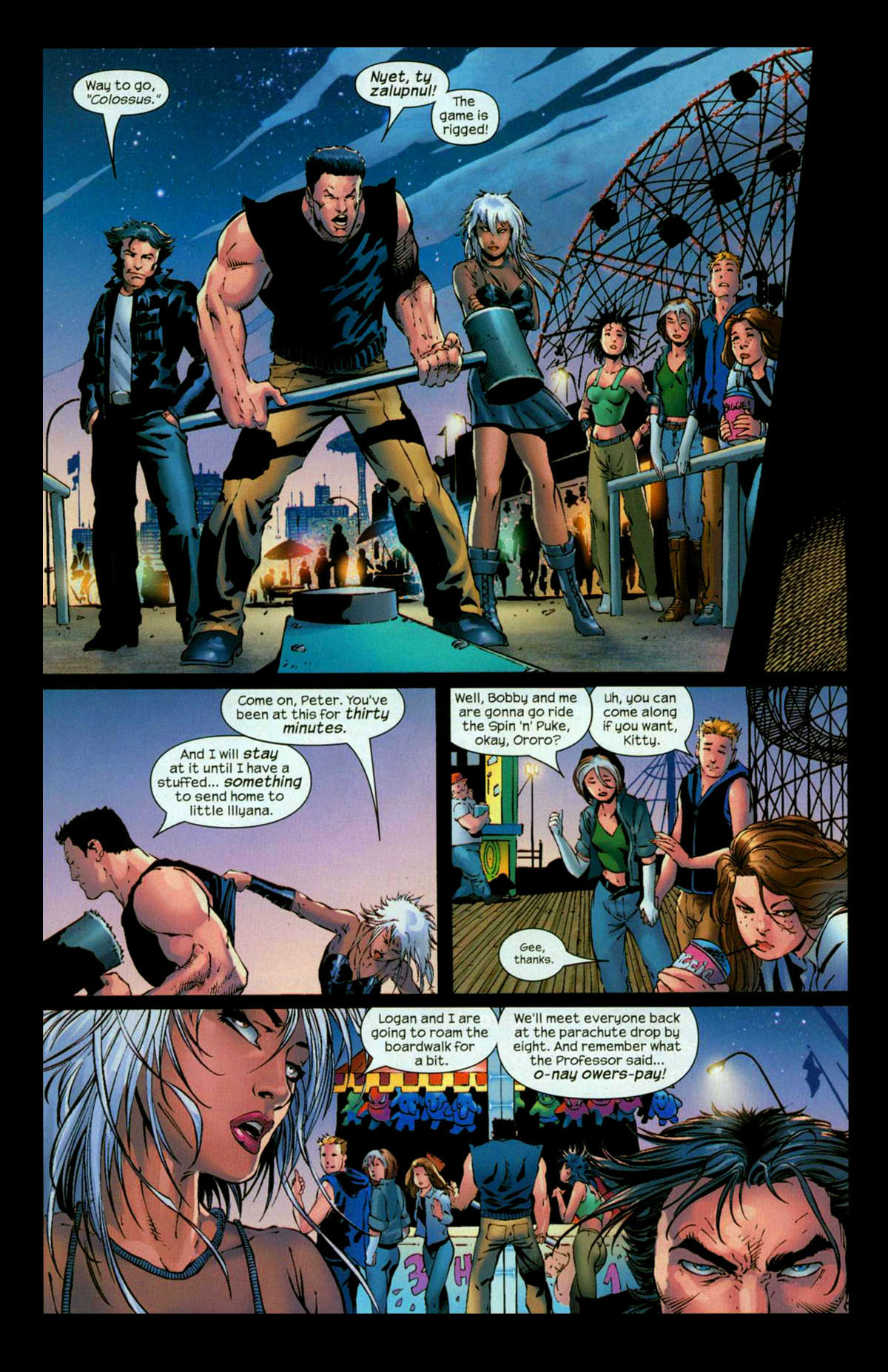 The team goes to Coney Island While Ultimate Rogue is in the bathroom, Iceman kisses Shadowcat, who gets knocked out by Rogue Gambit is introduced & he blows up Wolverine's head Colossus keeps failing at the strong man hammer challenge, which is fun