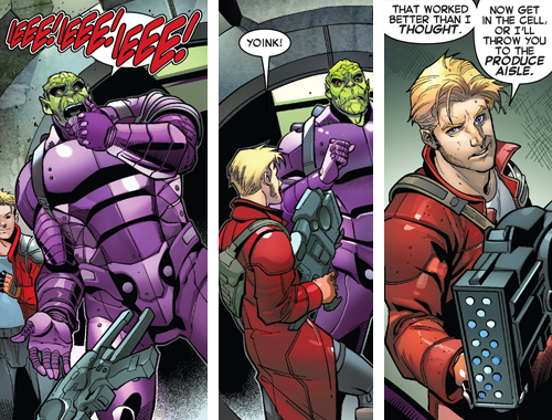 Quill helps Pryde get the food off of her costume with a water gun, that can’t lead to anything, right?