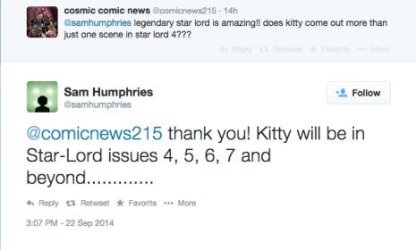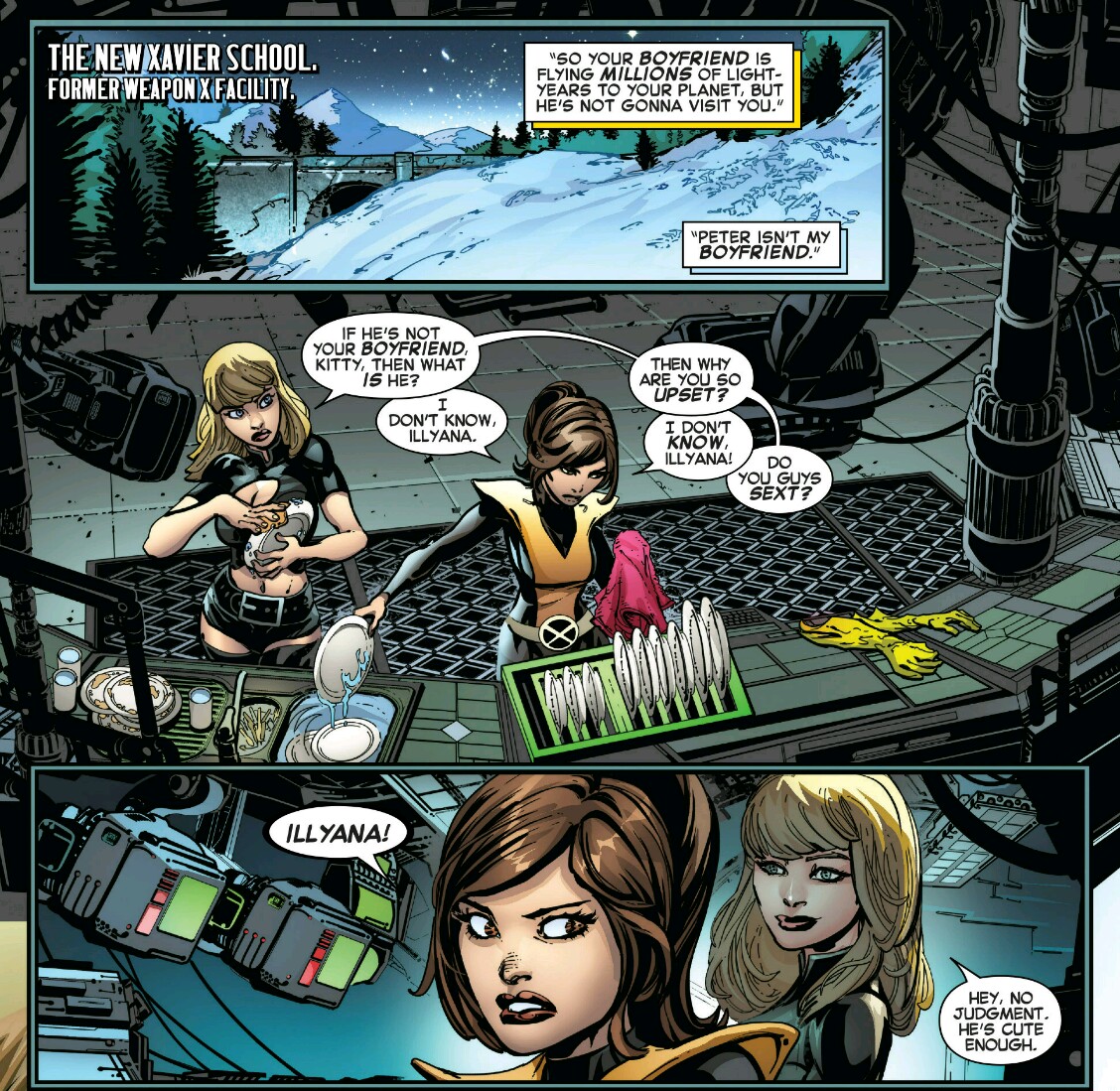 Quill makes the mistake of comparing himself to Wolverine. Kitty has to correct him, Logan was no thief – he was a man of honor. Quill may not have known that Wolverine is dead.
