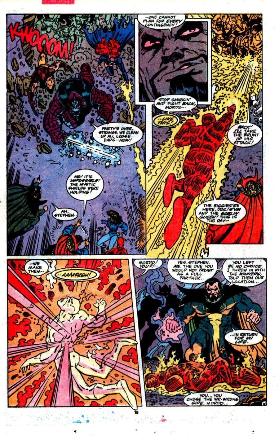 The mages are using a cloaking spell to keep the demons away. They are – Doctor Strange, Margai Szardos, Jennifer Kale, Doctor Druid, Hellstrom, Dakimh, Baron Mordo and Shaman. I’m not sure who Dakimh is but I recognize everyone else. Who knew his whole name was – Baron Karl Amadeus Mordo? Baron, of course, is his sweet title.
