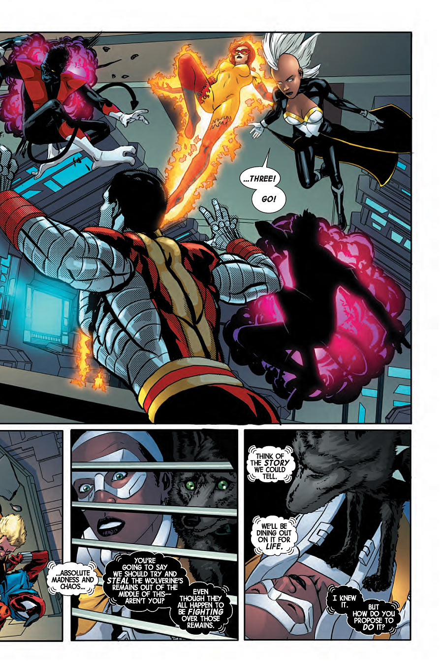 Sinister sends his henchmen after the X-Men and a fight breaks out. Fantomelle comes up with a scheme to steal Logan’s body. Scarlet Spider clones take on Sabretooth. The fox refers to the statue as, Logan’s remains; that is a decent description for it.