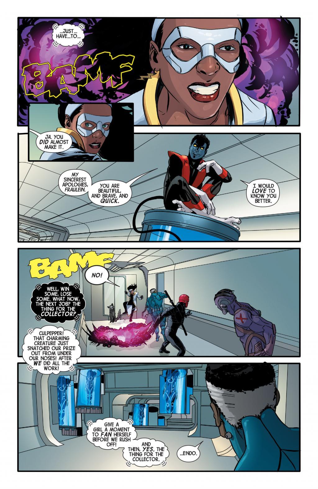Fantomelle is almost to the exist when Nightcrawler teleports on top of Wolverine and teleports away. Fantomelle and Kurt get a quick moment to flirt.