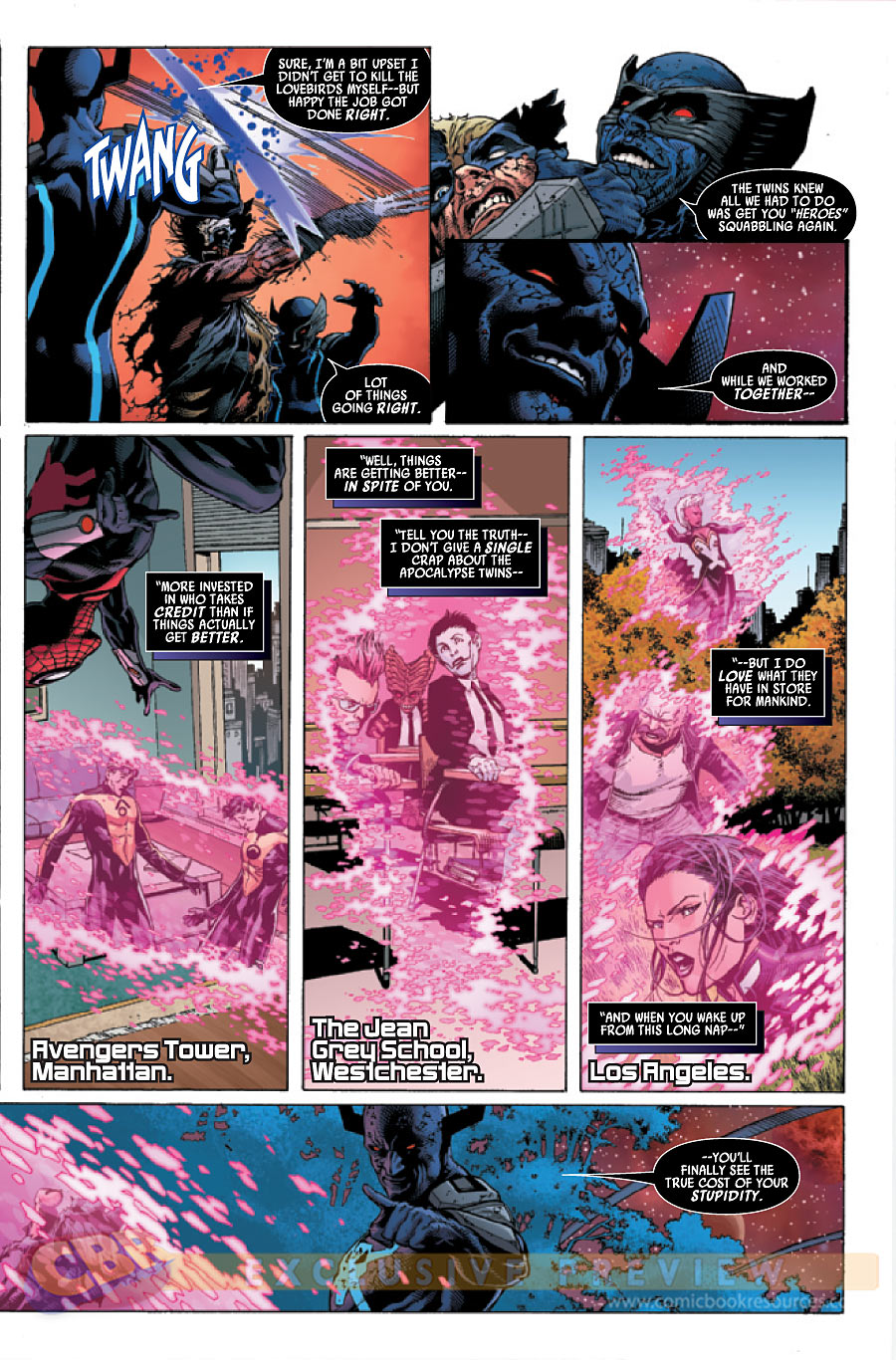 It has always bugged me Kitty’s stance there. What is she even doing? Also, what is Emma doing, pointing those guns at Captain America! Cyclops looks on, approvingly.