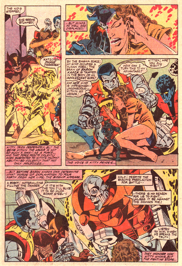Karza has switched into a new outfit that looks pretty stylish. Kitty is afraid she will never get her body back. Storm tries to comfort her.