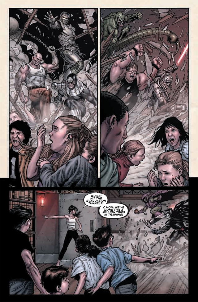 Now, we get to the panel that got me to buy the issue. That brunette, in the third panel – telling everyone to get to the evacuation tunnels, that has to be Kitty Pryde, right? It is her or X23 but I say, X23 would be popping her claws and heading towards the attack. Kitty would hang back, and make sure the students were okay. There are not that many brunette X-Women, and not that many with a modest breast size. Sorry but in a world of Double Ds and larger, normal breasts stand out.