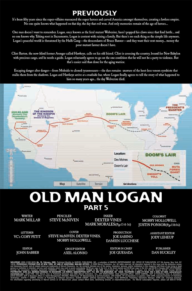 May I say, that I’m a huge sucker for fictional maps? I love just looking at them, at the landmarks that the map maker deems important. Then I look at where Yuma, Arizona is – here it is in the Kingdom of the Kingpin (formerly the Domain of Magneto). The names of cities hold so much potential story and history. Montana falls in the vast unclaimed area, the Wastleland, I believe they call it in this title.