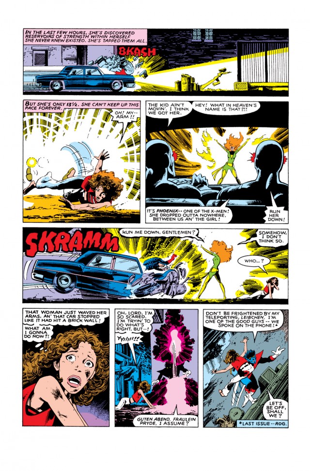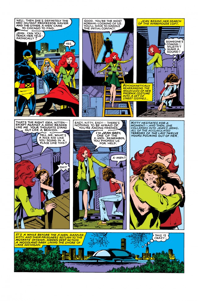 Phoenix tracks Kitty and finds her. We get the classic hug from Phoenix and Kitty, the only real interaction Kitty has with her. The moment is recreated in All New X-Men 6 and 11, where Kitty hugs the teen Jean Grey.