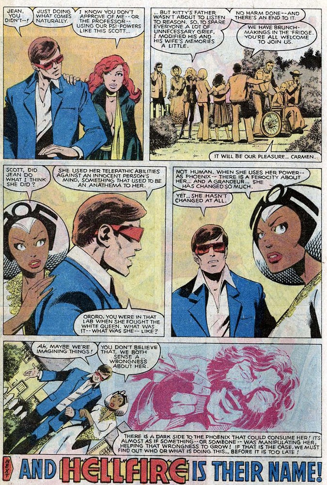 Issue ends with the X-Men needing to take the fight to the rest of the Hellfire Club. Storm mentions how there is a dark side to the Phoenix.