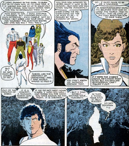 Meanwhile, the X-Men – Shadowcat, Rogue, Cyclops, Wolverine, Rachel, Nightcrawler and Storm – are discussing their next move. Kurt wants to call the New Mutants to help but Storm shoots that down as they are merely children and will not be involved in this. Scott states that the Avengers and Fantastic Four can’t help, as they will arrest the X-Men under suspicion. Another story point that isn’t a concern in modern comics.