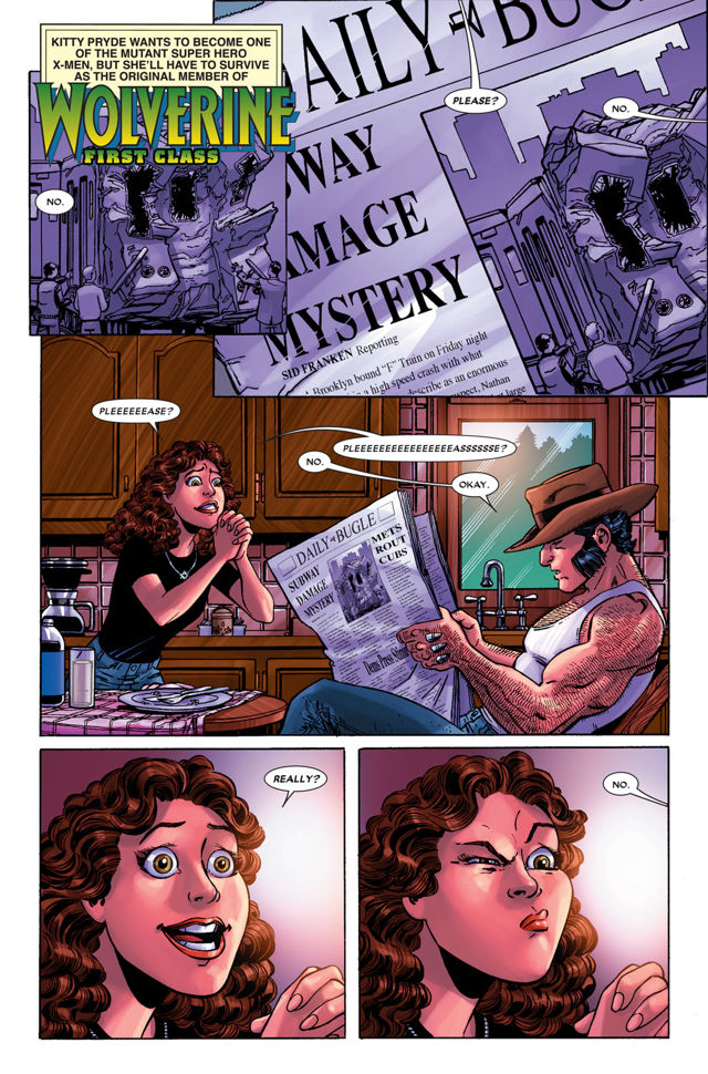 Issue opens with Elektra standing in front of Wolverine and Kitty Pryde. The two assassins stare each other down and jump towards each other.