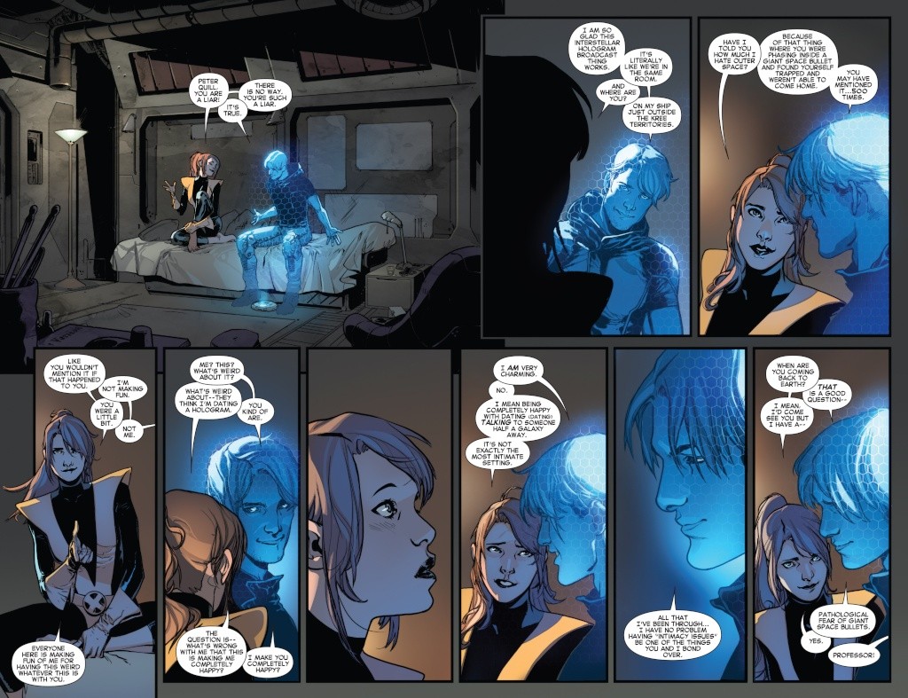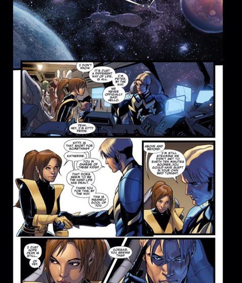 We are treated to an excellent two page spread. I really like the coloring. The Guardians are bringing the X-Men home. Kitty is hanging out with Starlord, he talks about how his father is the worst. Dudes with daddy issues.