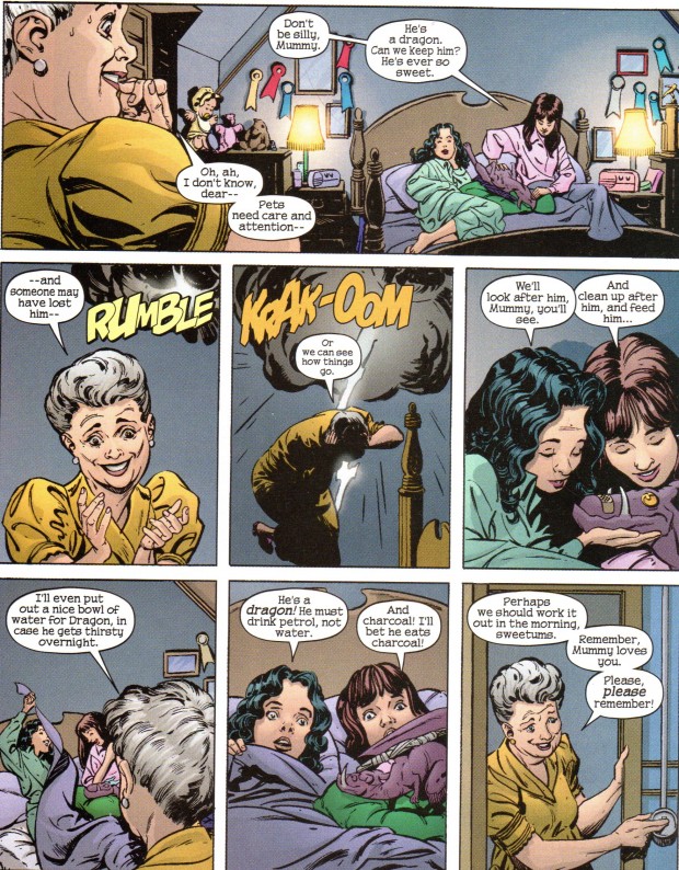 They take him home and start caring for him, as if he is a cat. Their mother comes in, not sure if she wants a dragon in the house. Here, they threaten her with a storm cloud and she hurries away. So clearly they torment her all the time. Also, they are witches. Also, something that rhymes with witch.