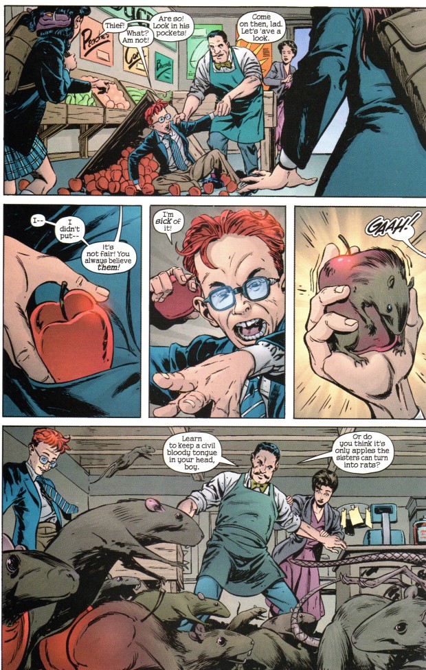 The store owner finds the apple, the boy keeps protesting that he wasn’t trying to steal it. The girls tire of this and turn the apple into a rat. Then all the apples turn into rats. Which is bad, but then the worst happens – all the rats become a giant rat! Even worst … they still have tiny rat hands! It is gross.