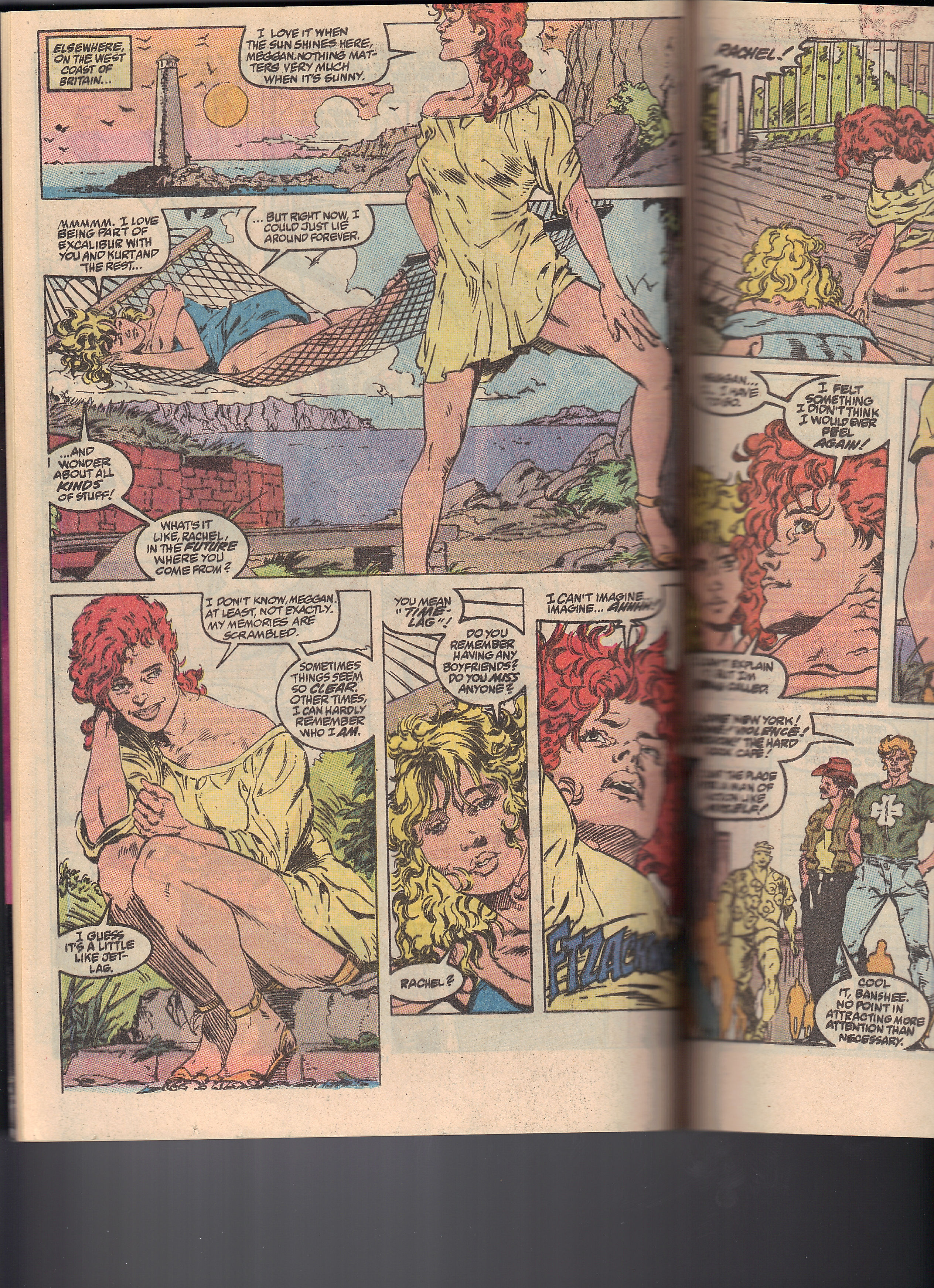Cut to Meggan and Rachel on the west coast of Britain, and the reason I own this issue. I guess I am keeping it. Meggan likes being part of Excalibur and she names Kurt but she really likes these times where they can relax. Meggan is drawn like I’ve never seen her drawn, pretty realistic. I like Excalibur’s art teams but they have that comic book / clean cartoon style and Guice here is trying a more adult art style. I’m not sure if that’s the best way to describe it but its close.
