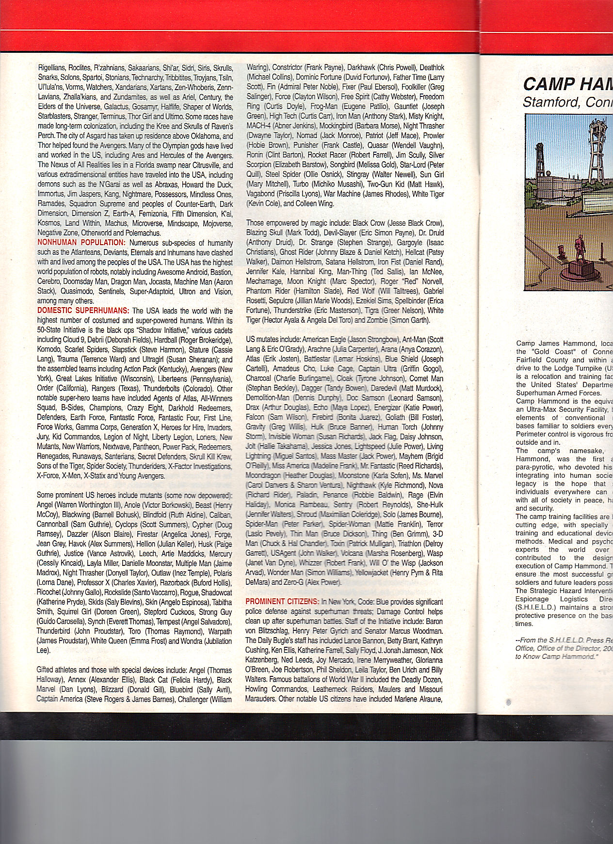 Each entry gets – Official Name / Population / Capital City / Places of Interest / Government / Major Languages / Monetary Unit / Major Resources / National Defense / International Relations / Extraterrestrial Relations / Nonhuman Population / Domestic Superhumans / Prominent Citizens / Superhman Residents / Domestic Crime / International Crime / History.