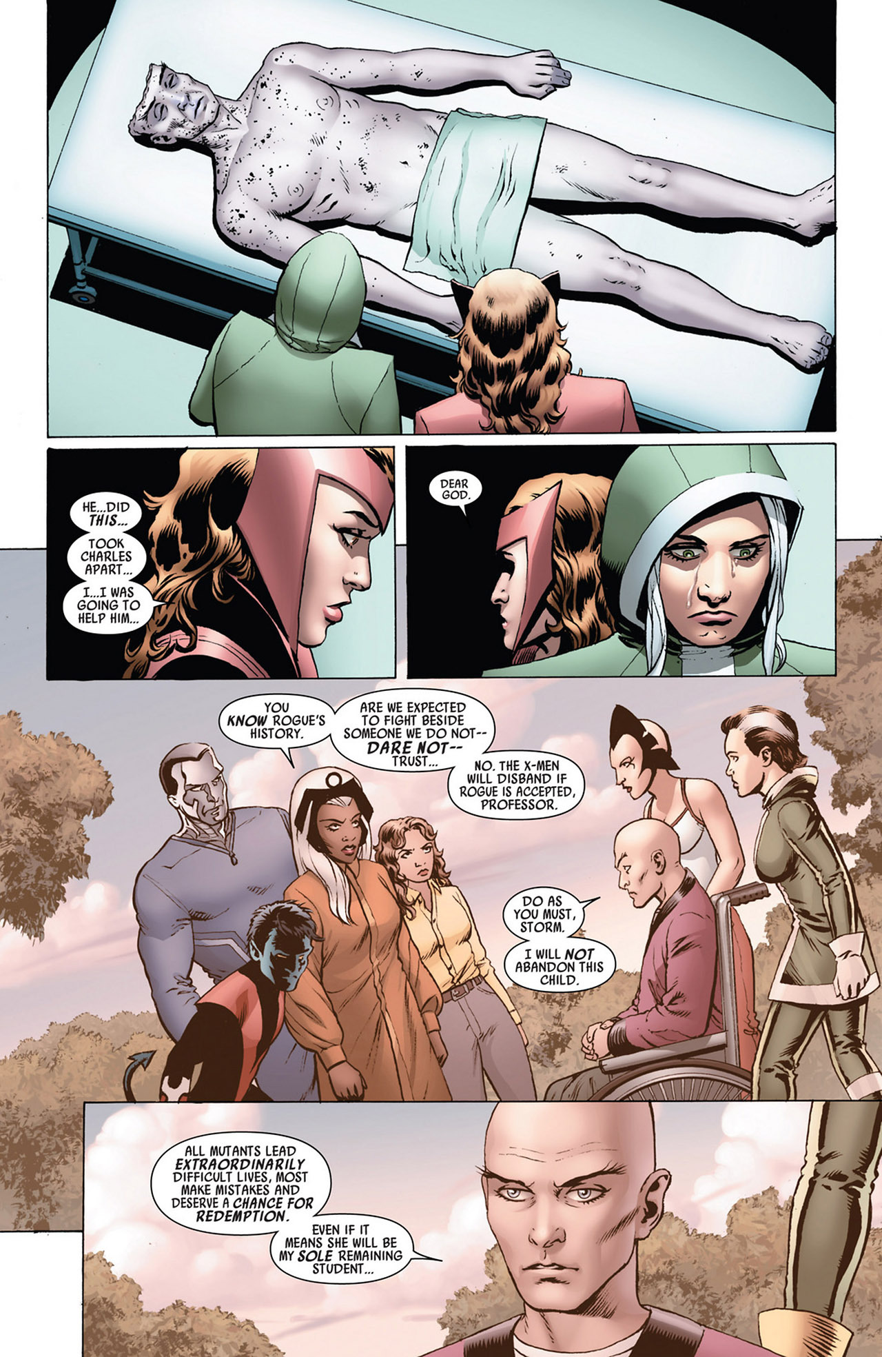 Xavier’s dead body . . . minus one brain. Rogue has a quick flashback to Xavier being kind to her, from Uncanny X-Men 171 (the non-Paul Smith drawn issue of the run). Nice to see Kitty, drawn by Cassaday again.