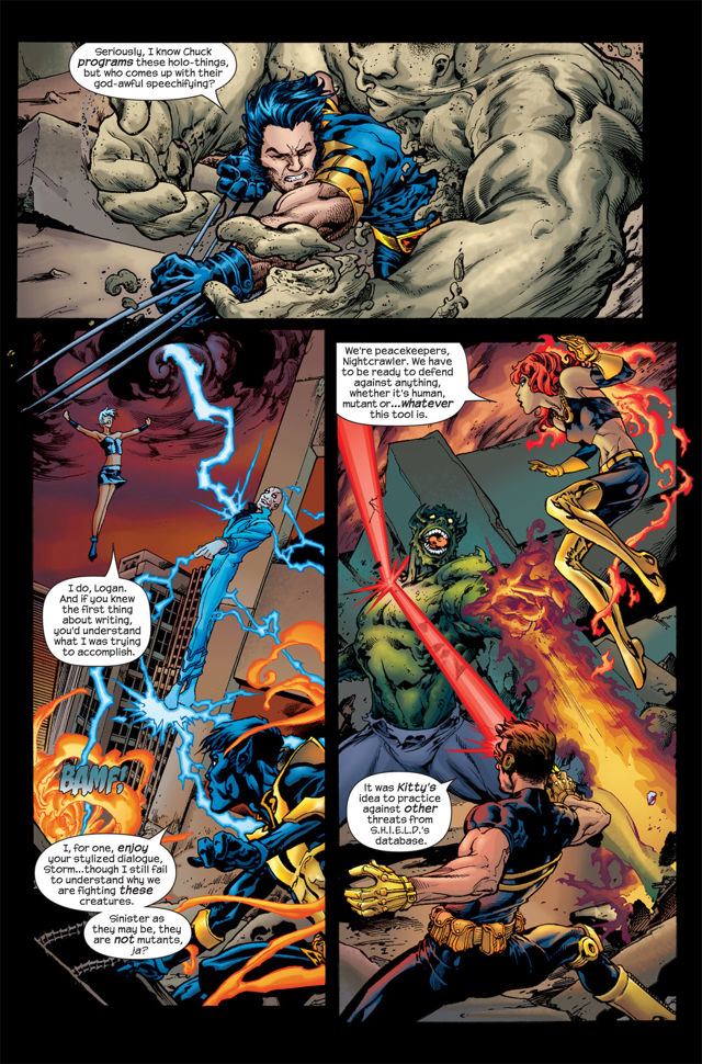 We see that Nightcrawler and Angel are in a Danger Room Pirate scenario. Angel wonders if they are going to get into trouble and Nightcrawler suspects Xavier is off rehearsing a dumb speech. Turns out, Xavier is enjoying watching the session.