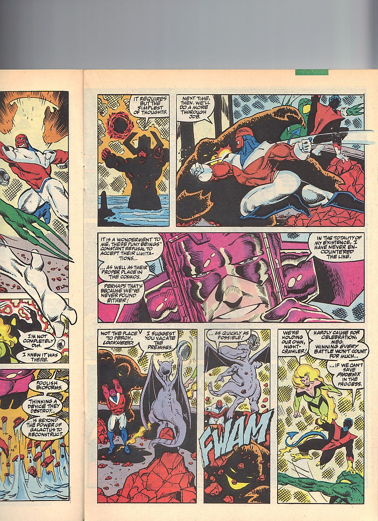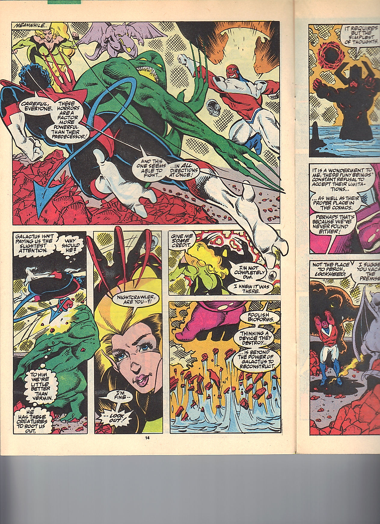 Issue opens with Captain Britain, Meggan and Nightcrawler – outside of the lighthouse, looking up. They see a giant spaceship. They head up to investigate it. Kurt teleports inside of the ship. He runs into a ghost horse boy combination. I instantly recognize the ghost / cloud aspect to be Mass Master from Power Pack.