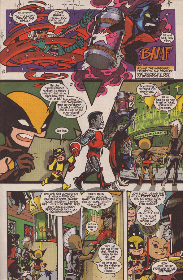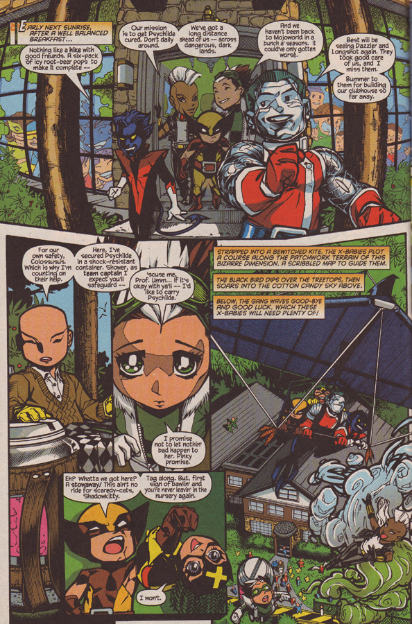 The X-Babies continue their quest. Colossusus is told to hold Shadowkitty’s hand, which delights her.