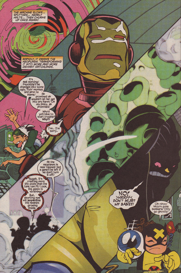 Spiral finds the X-Babies, and tries to steal away with the tank containing Psychilde. She wants the material to create the next batch of creatues, as the material is hard to come by.