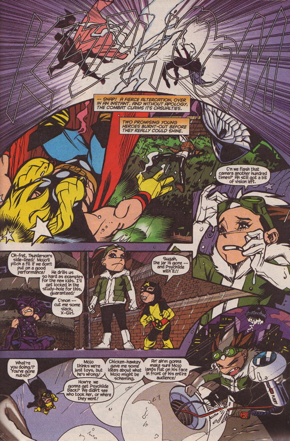 In Sugah’s zeal to win, she makes a dash for the ball. Prof X wants them to stop the exercise. Psychilde also wants to win, and dives for the ball. Sugah grabs the ball, Psychilde grabs Sugah’s exposed arm. The psychic backlash knocks them both for a loop.
