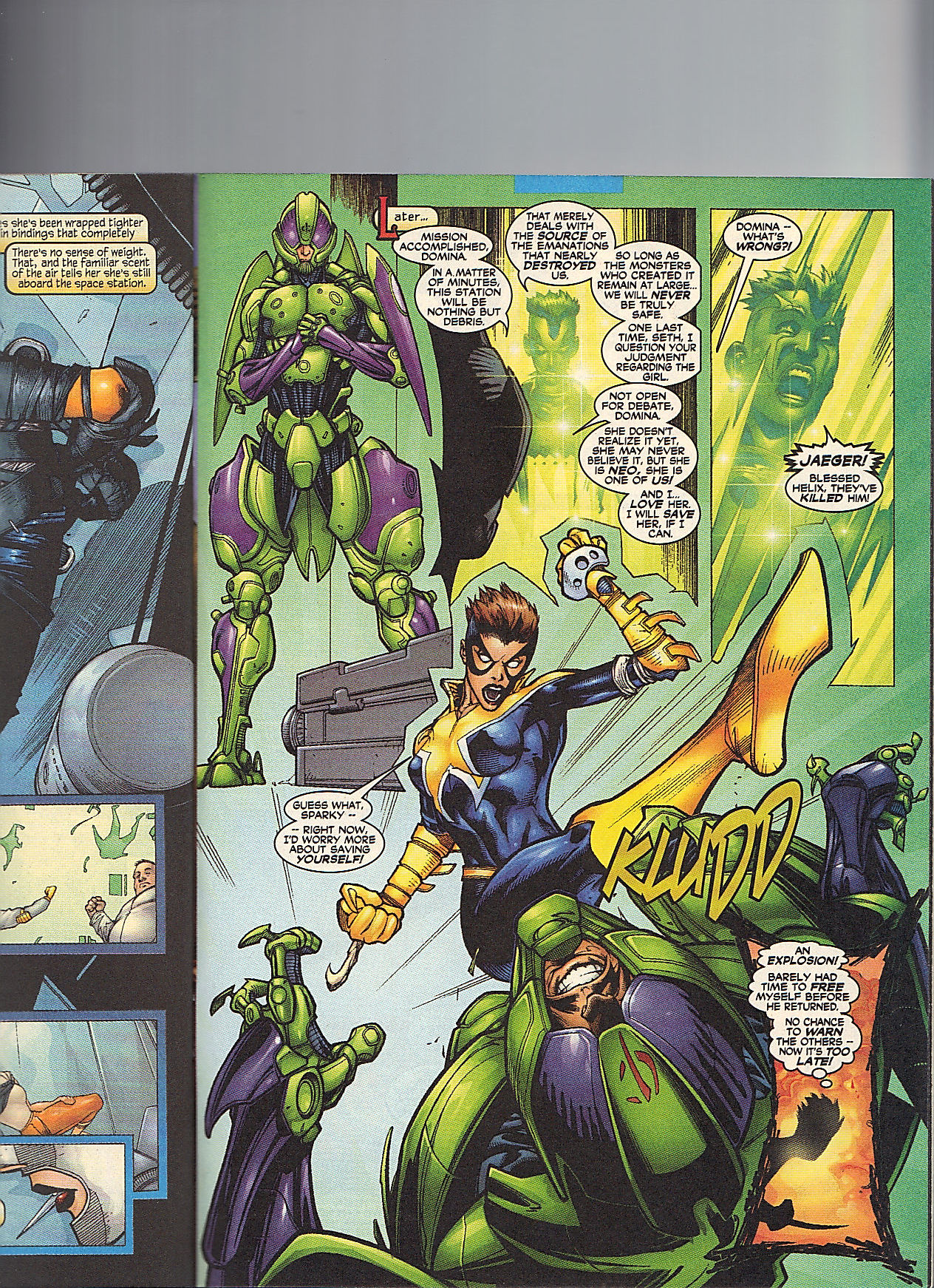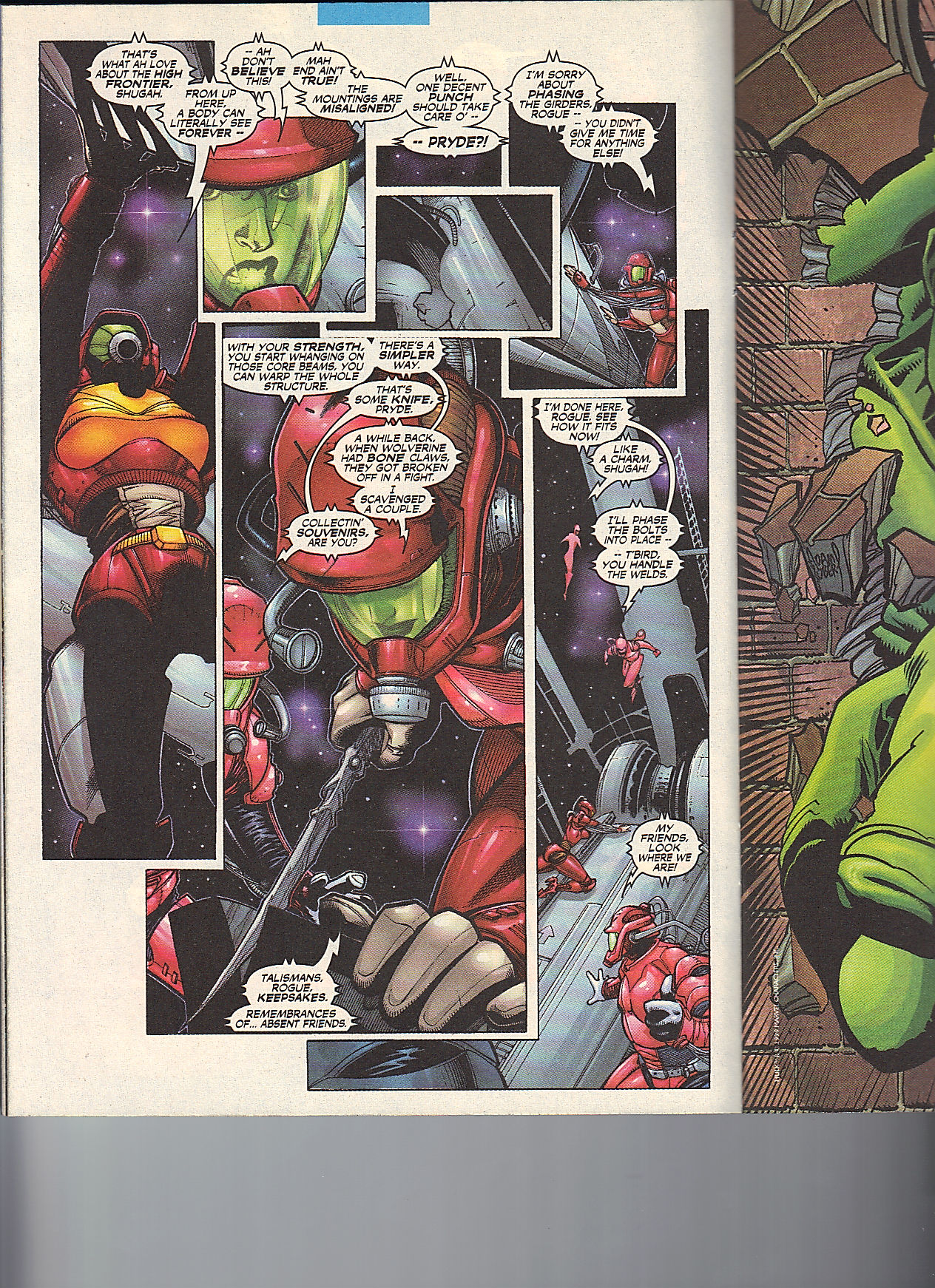 Calcutta. Neal is the first to wake up. He sees his brother, Sanjit. Bastion explains that Sanjit is no longer human, instead, he is a Prime Sentinel – a human / Sentinel hybrid. Operation : Zero Tolerance was three years ago at this point (1997) but he is still around. Claremont takes this opportunity to explain his name. His goal is to stand as humanity’s final bastion against the forces that threaten to destroy it.